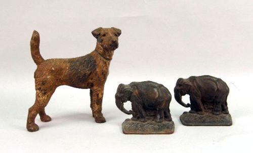 Together with a pair of cast-iron elephant bookends. 3 pieces. The terrier 9"h, the elephants 5"h