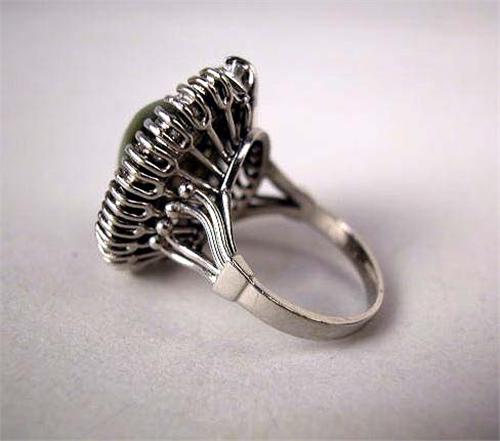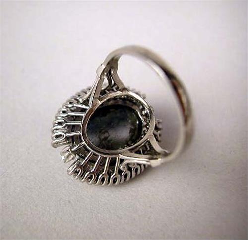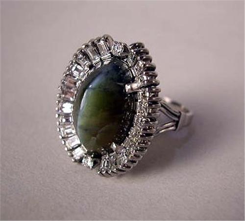 A CAT'S EYE AND DIAMOND RING IN PLATINUM AND WHITE GOLD One cat's eye oval cabochon, weighing apx. 13.82 carats, with two full cut diamonds, total estimated weight apx. .10 carat, clarity VS1/VS2, color G-I, and twenty-two straight baguette cut diamonds, total estimated weight apx. 1.10 carats, clarity VS1/VS2, color G-I