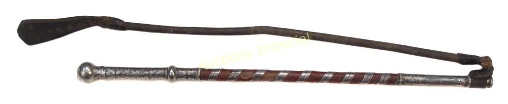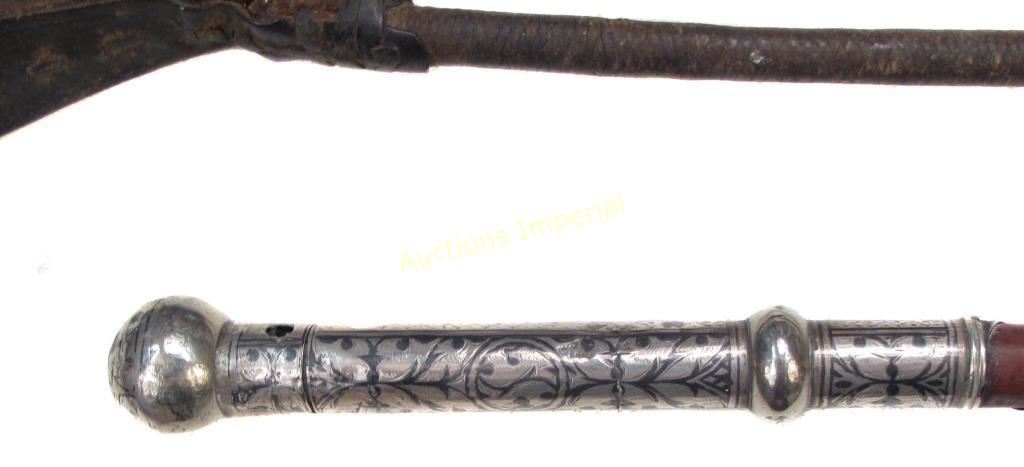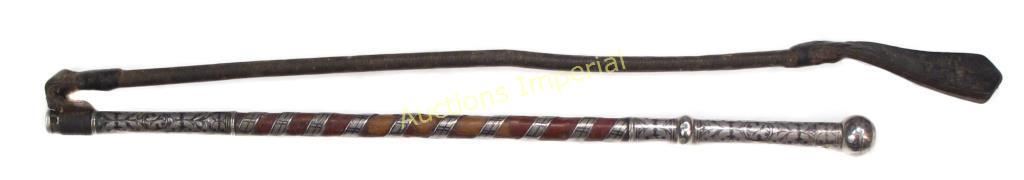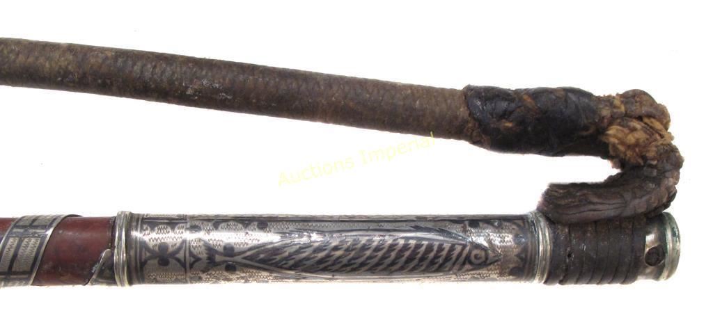 The red-lacquered wooden grip with engraved and nielloed mounts. Retains its original lash. First half of the 19th century. Light wear. Overall length 44.4 cm.