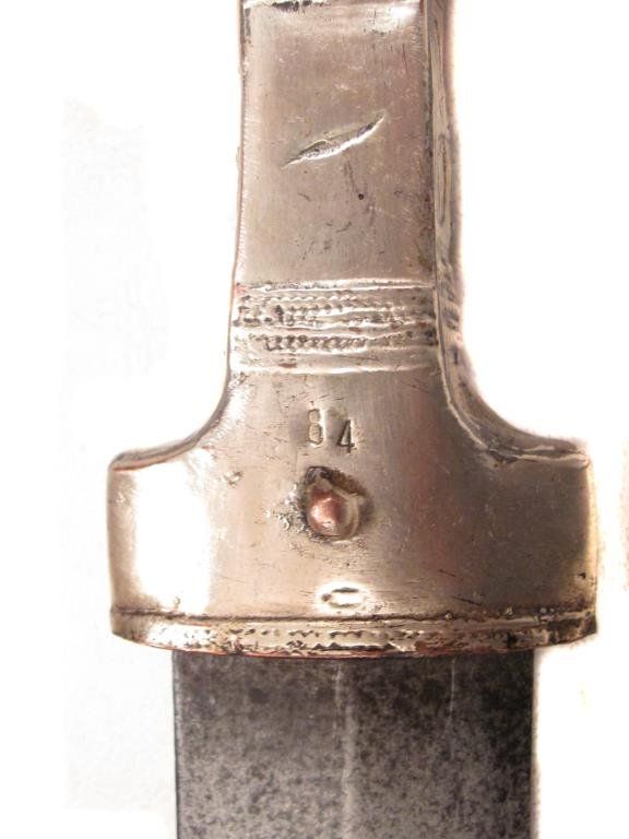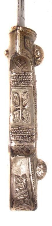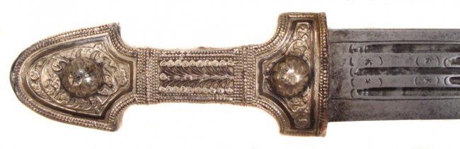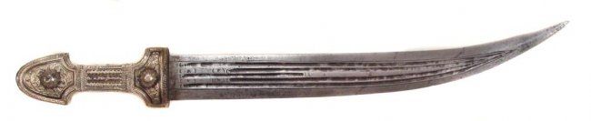 Handle of silver with niello and filigree, curved double-edged blade with multifullers.