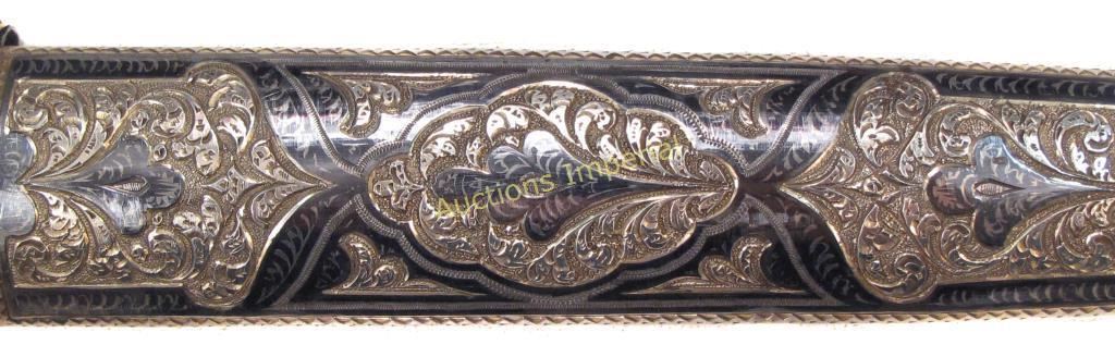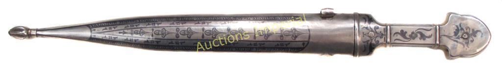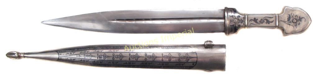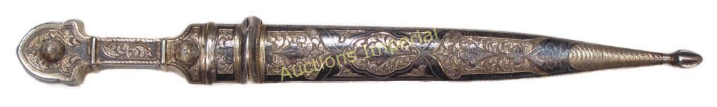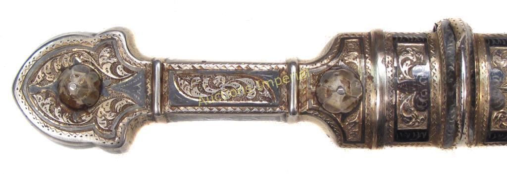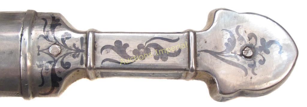 Of typical form, wrought entirely of engraved, nielloed and gilded silver. The double-edged blade with tapering tip and double fullers. First half of the 20th century. Minor dent to suspension band . Overall length 40 cm.
