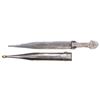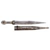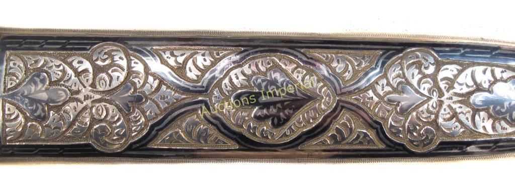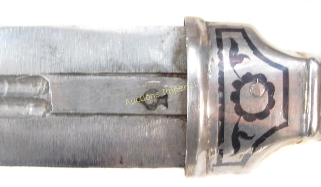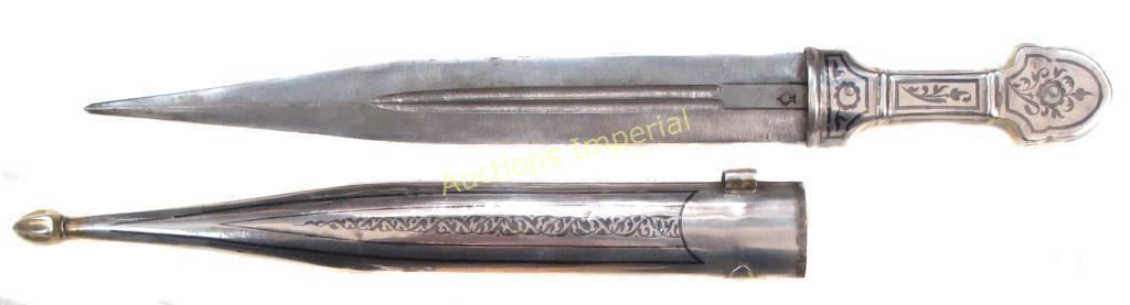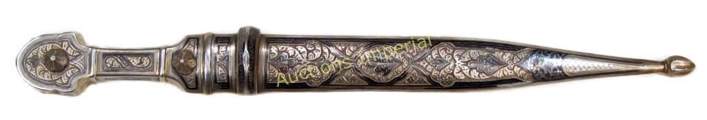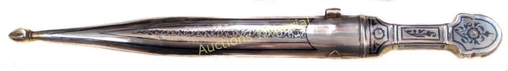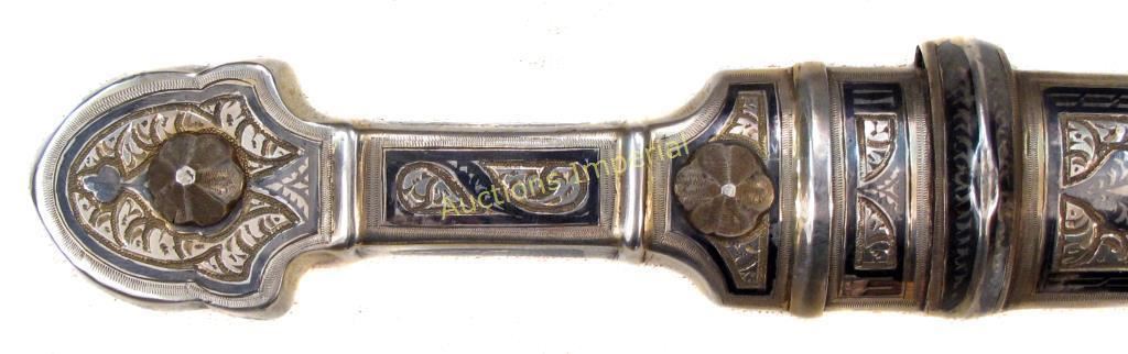 Of typical form, wrought entirely of engraved and nielloed silver. The double-edged blade with tapering tip and double fullers with struck maker’s mark at the forte. First half of the 20th century. Minor dent to suspension band . Overall length 39 cm.