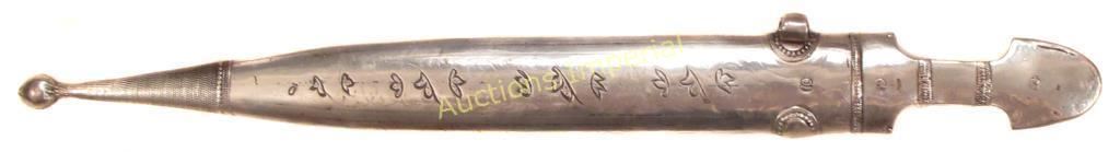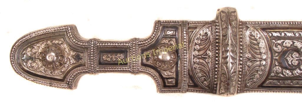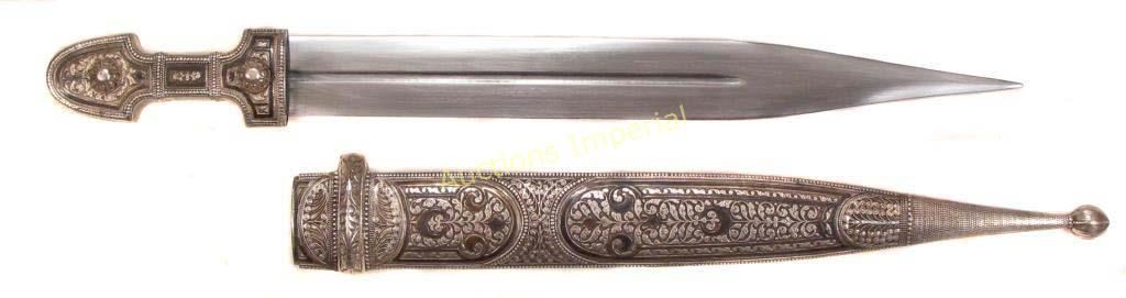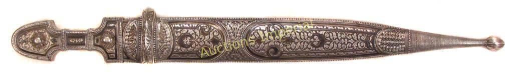 Lakh work, engraved, nielloed and silvered, with panels of fine filigree, struck on the reverse with a Georgian (?) mark. Fullered, double-edged blade. Early 20th century. Some wear. Overall length 48.4 cm.