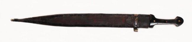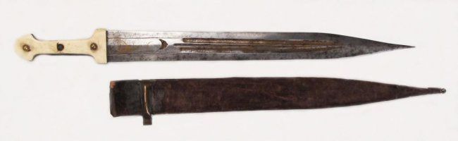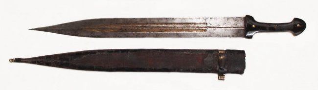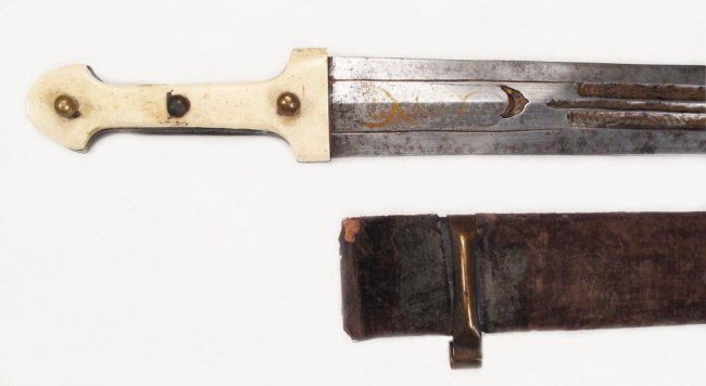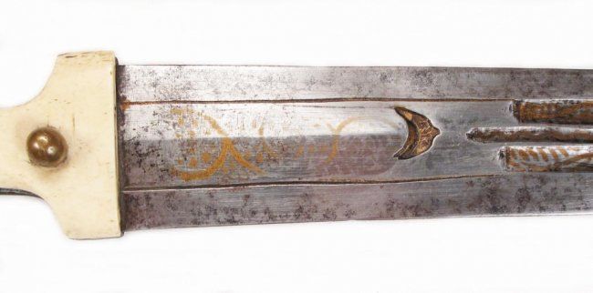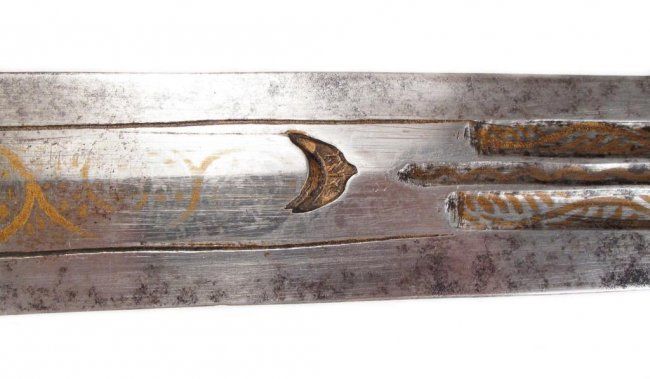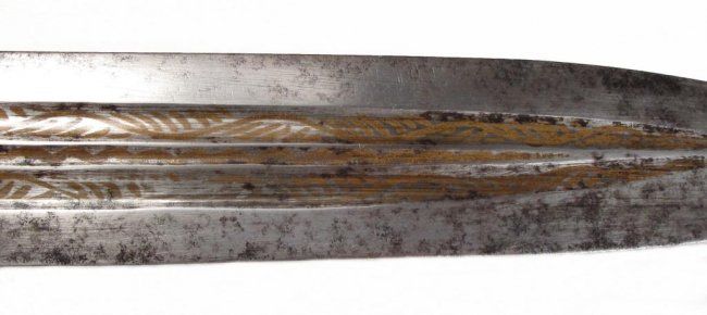 With antler grip on the obverse and horn on the reverse, the massive blade with three central fullers to either side, and struck at the forte with a gilded maker?s mark of crescent form, the forte and fullers further inlaid in brass vinework. In its velvet-covered wooden scabbard.Latter 19th century. Light wear. Overall length 58.4 cm.