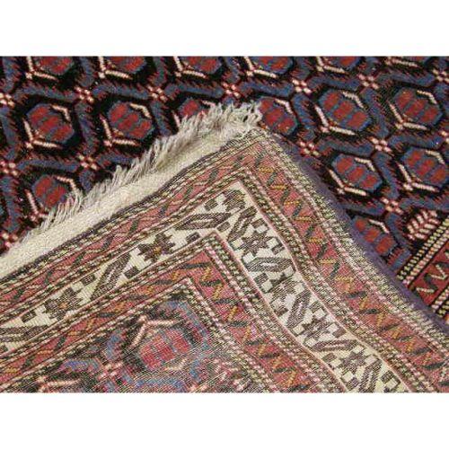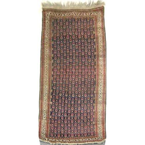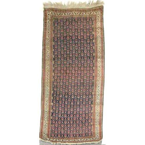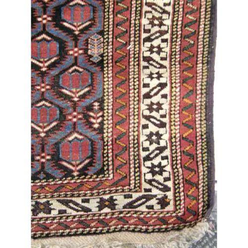 A CAUCASIAN RUG<BR><BR>With repeating medallions on a dark blue field within an ivory border, 8`10"l x 4`4"w