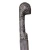 At some point in history, this blade was brought to the Caucasus, where it was set into a beautifully crafted niello handle in the style of the region. The eared handle is decorated with remarkably intricate floral, filigree, and geometric patterns throughout. Similarly executed niello work can be found on every metal fitting of the black leather-wrapped wooden scabbard.