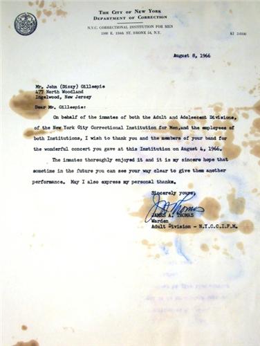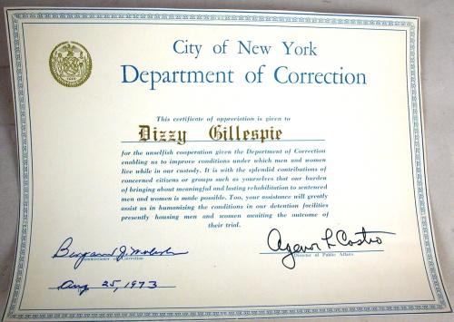 A CERTIFICATE OF APPRECIATION FROM THE NYC DEPARTMENT OF CORRECTIONS Together with a letter dated August 8, 1966 from the City of New York Department of Corrections, thanking Dizzy for the concert he gave, heavily stained, 2 pieces