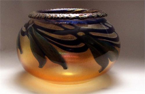 A CHARLES LOTTON ART GLASS VASE; Amber iridescent with green and blue leaf and vine design, raised iridescent and blue stripe rim, signed at base Sunset, Charles Lotton 1993, 5-3/4"h