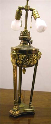 A CHARLES X STYLE FLUID LAMP; French, with masks on paw feet, electrified 33"h