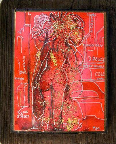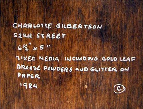 A CHARLOTTE GILBERTSON "52ND STREET" MIXED MEDIA Including gold leaf, bronze powders, and glitter on paper, depicting the back of a nude woman in front of a hot pink outline of 52nd street, copyright 1984 , 6 1/2"h x 5"w