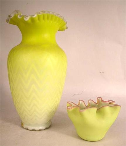 A CHEVRON PATTERN SATIN GLASS VASE; Shades of yellow over opaque white interior, flared ruffled rim, 10"h, together with a satin glass bowl, yellow with pink pinched ruffled rim, white interior, 3"h