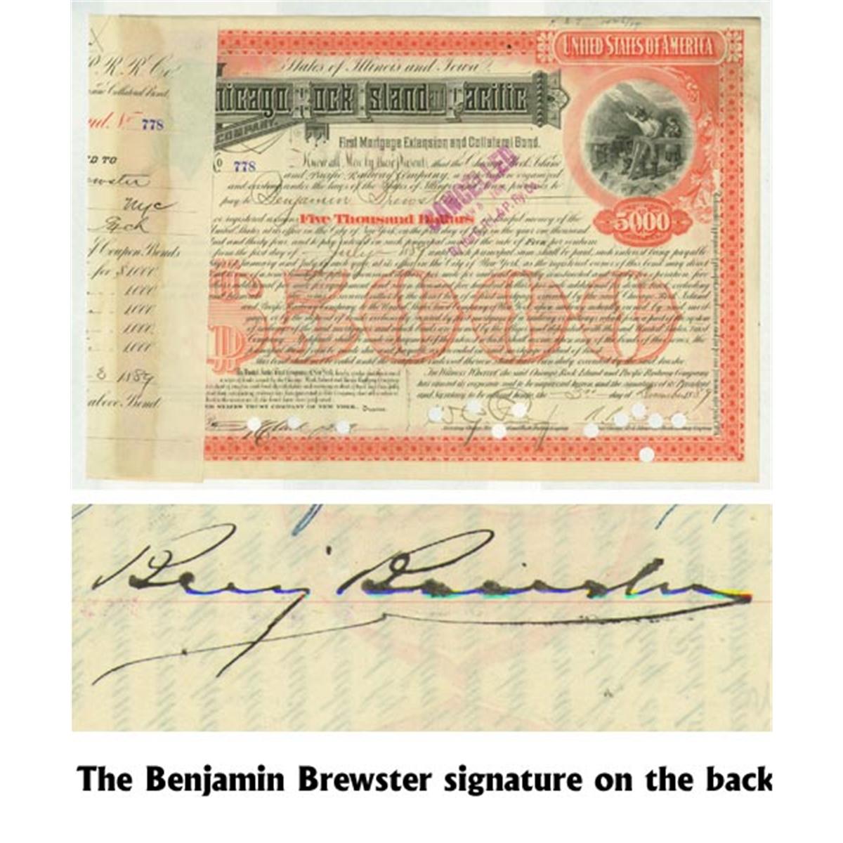 Benjamin Brewster. DS. 1pp. 13" x 9". Illinois. December 3, 1889. A "Chicago, Rock Island and Pacific" bond for $5,000 issued to and signed by Benjamin Brewster. There is a railroad vignette in the upper right corner and a receipt glued to the left side. It has been punch and stamp cancelled, though not affecting Brewster's large signature. It is in fine condition overall.