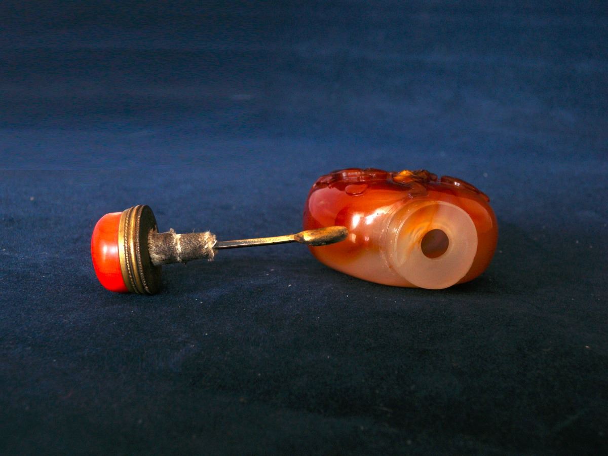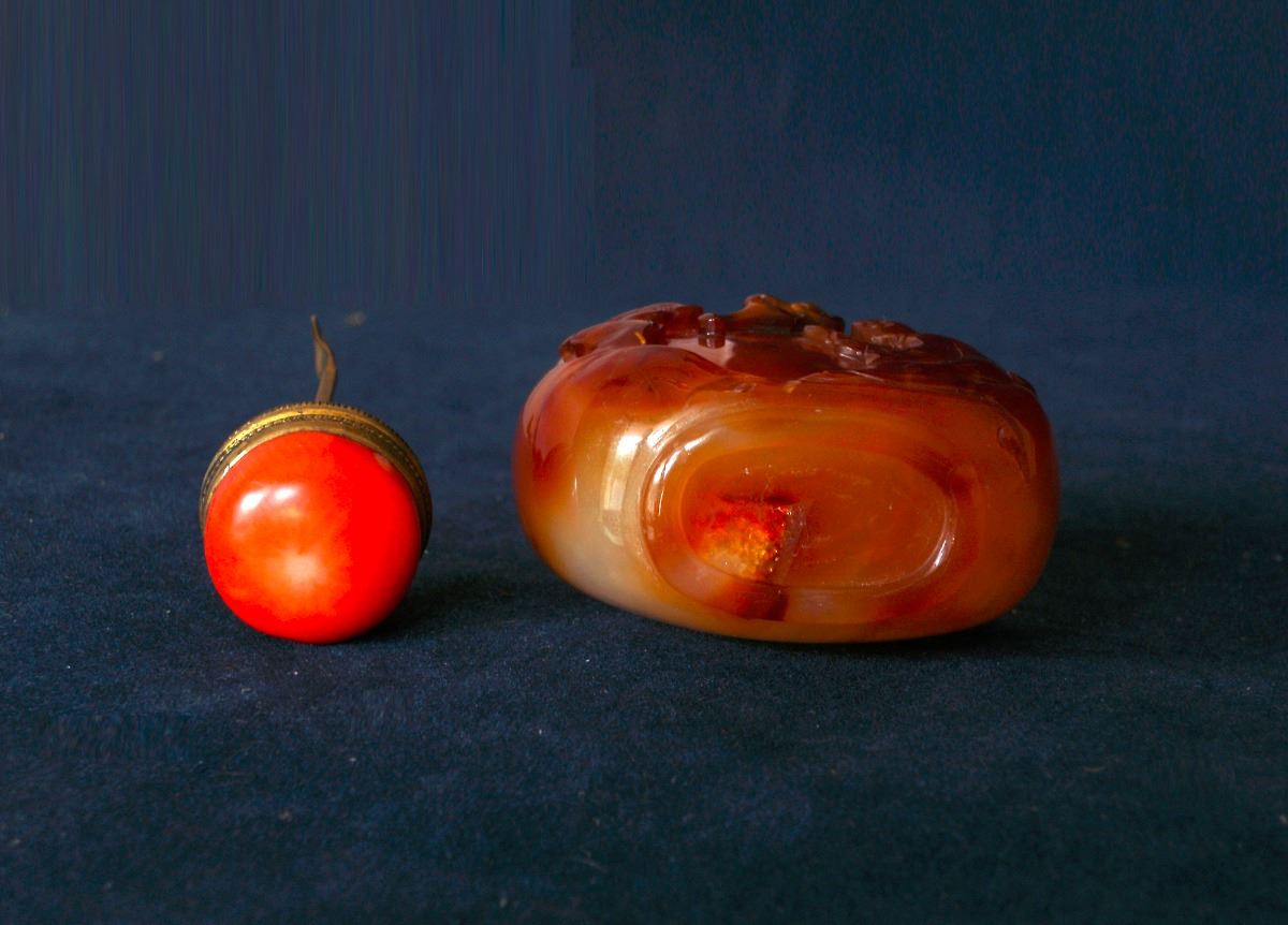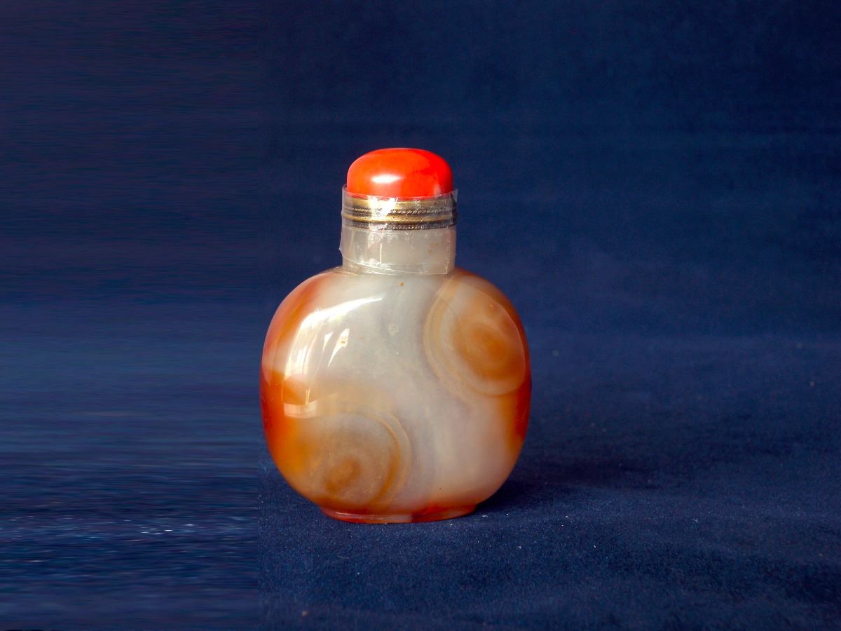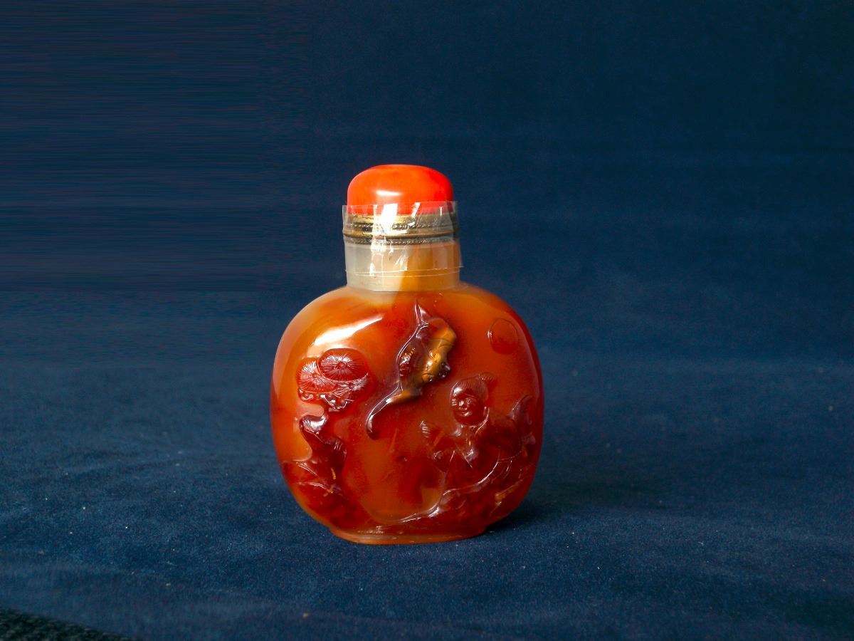 A Chinese agate snuff bottle with figural relief on the front. 2.75"×2"