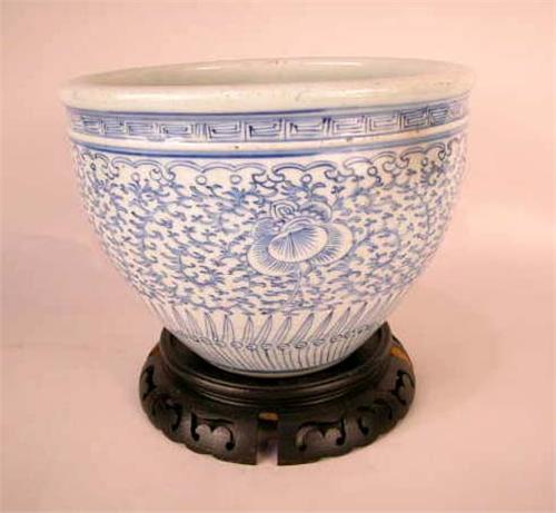 A CHINESE BLUE AND WHITE BOWL ON STAND; 10"h