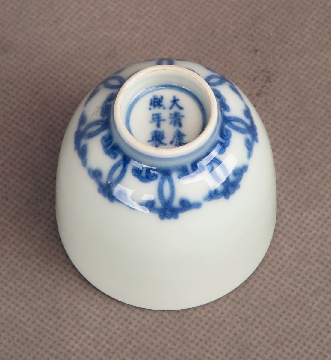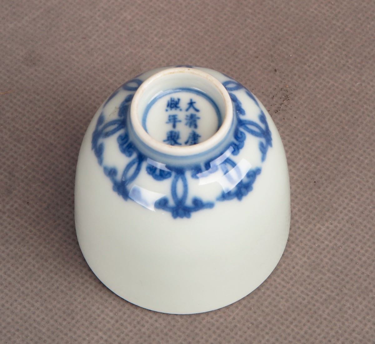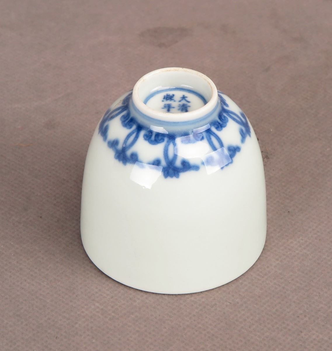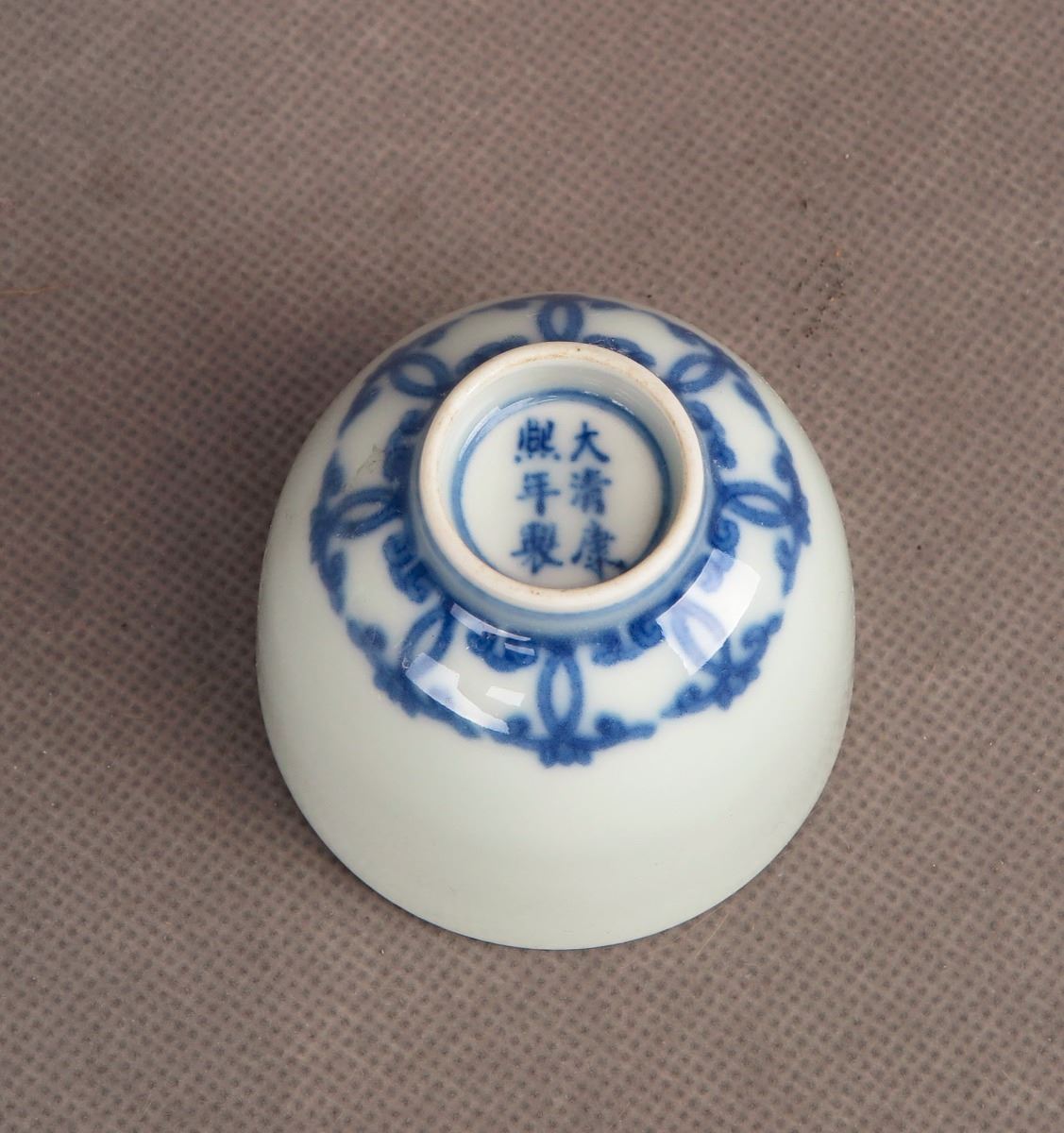 A Chinese blue and white cup with a band of cobalt auspicious patterns around the low foot over white-glazed body, six-character seal imprinted on a recessed base. Height 2", Mouth Diameter 2"