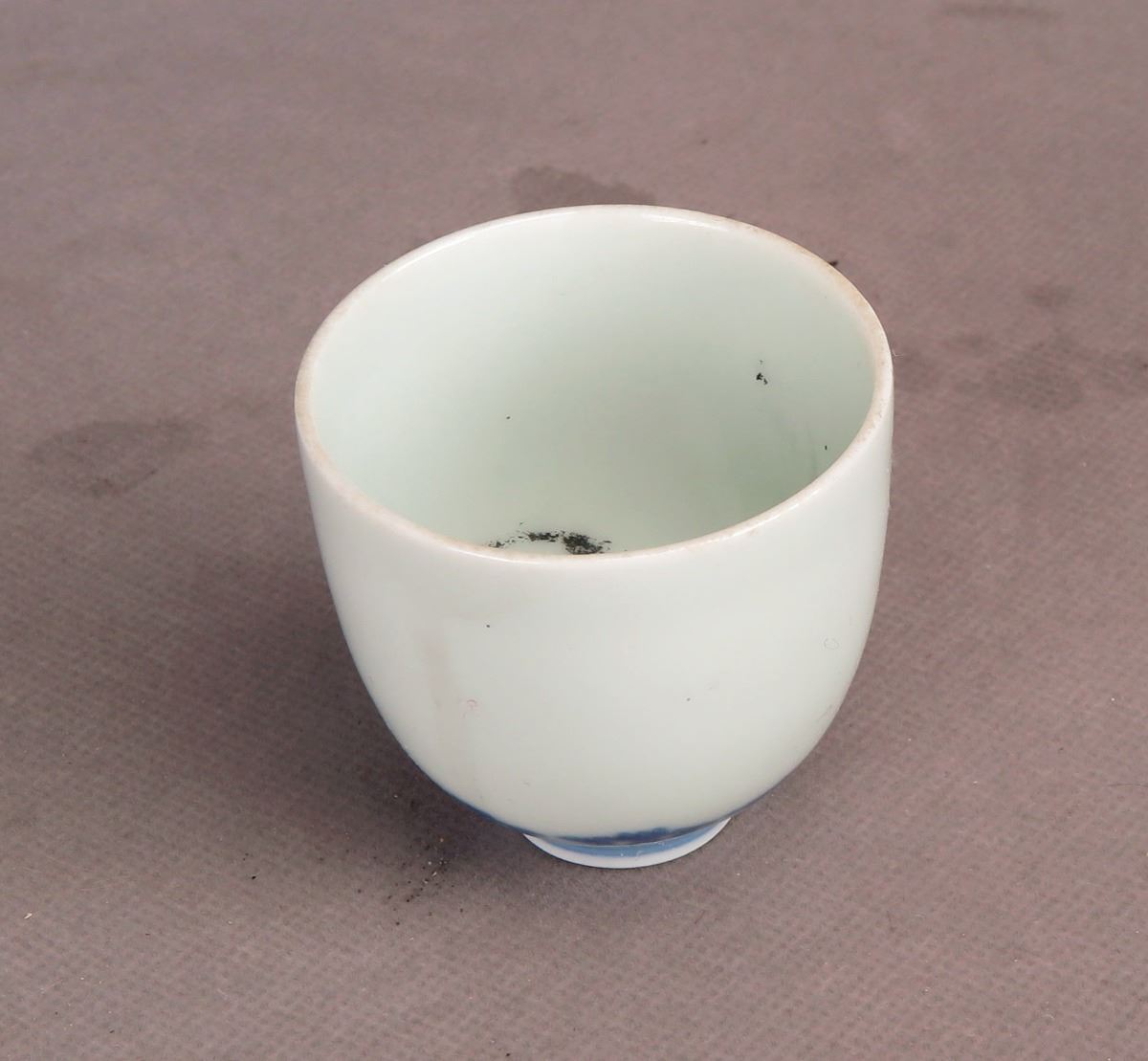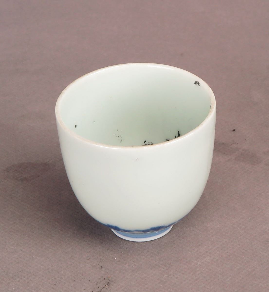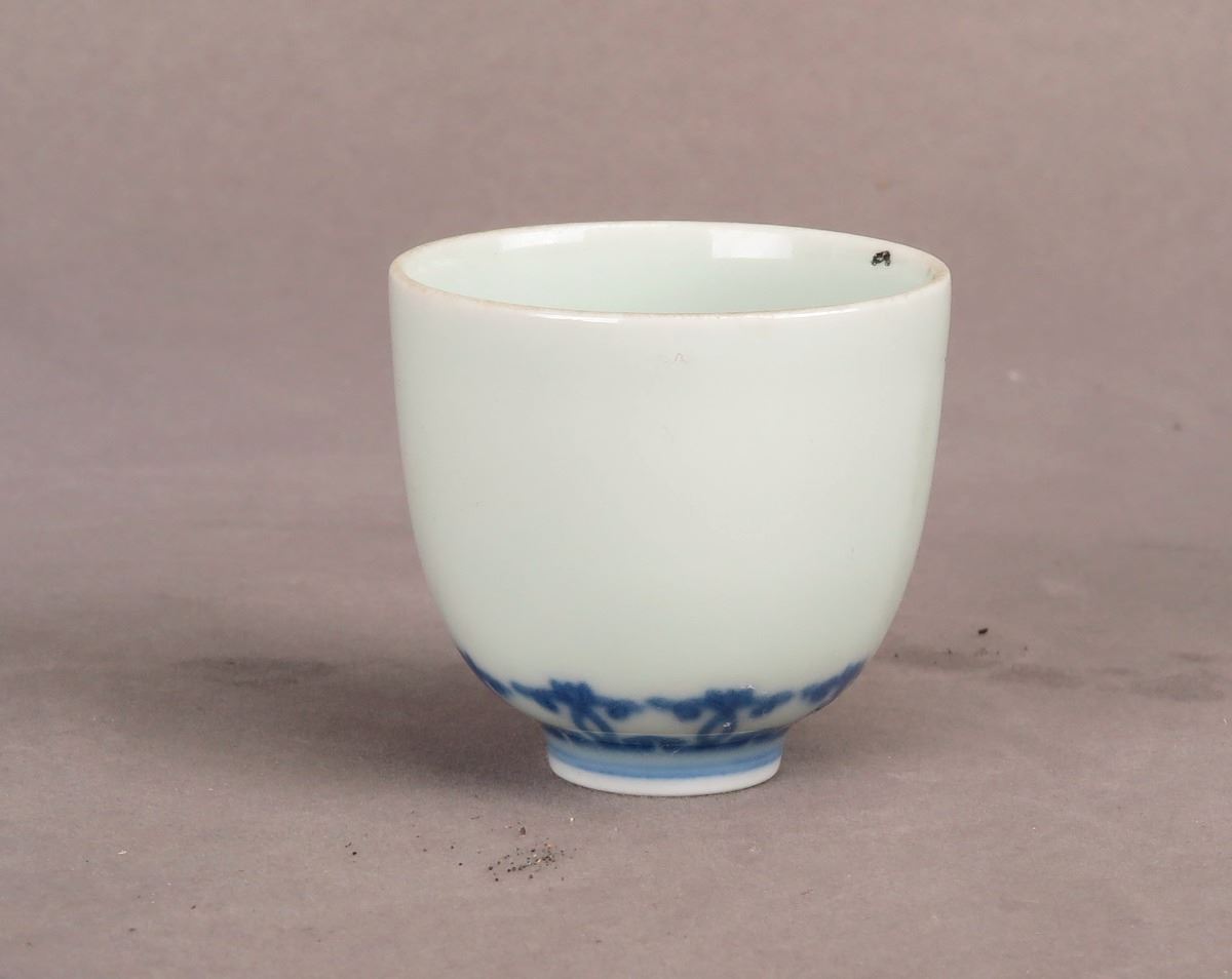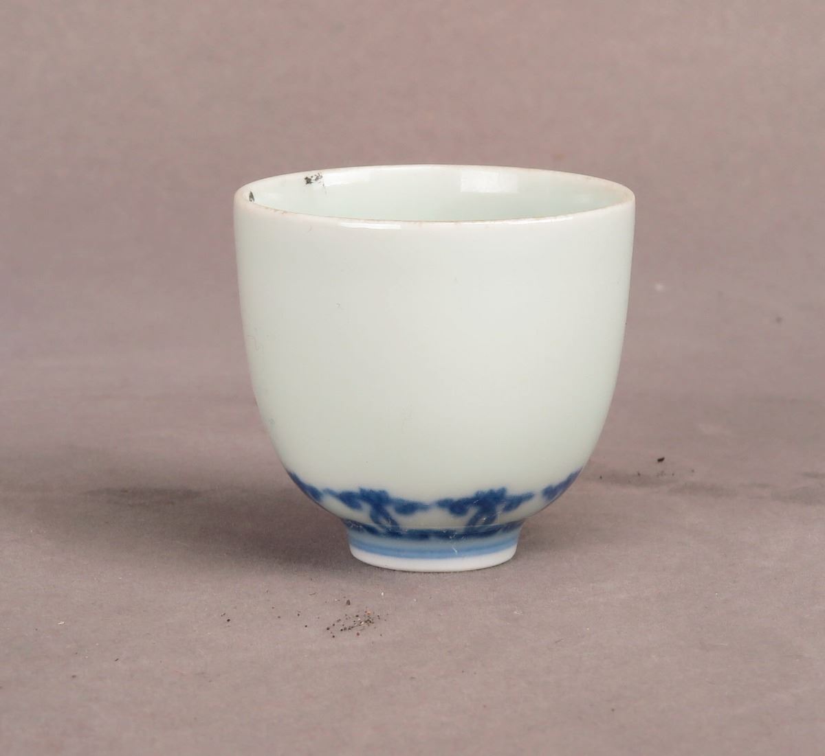 A Chinese blue and white cup with a band of cobalt auspicious patterns around the low foot over white-glazed body, six-character seal imprinted on a recessed base. Height 2", Mouth Diameter 2"