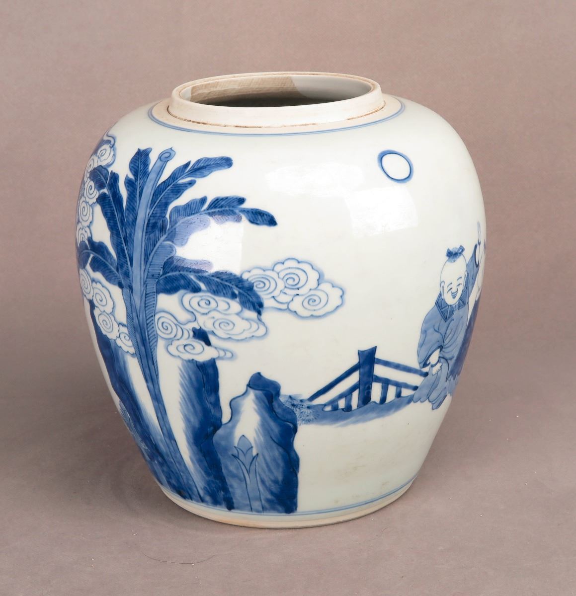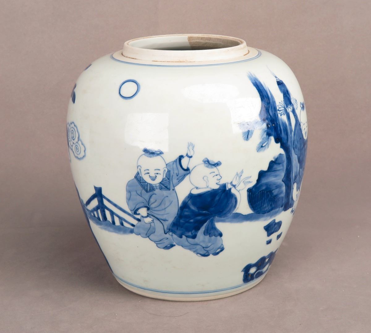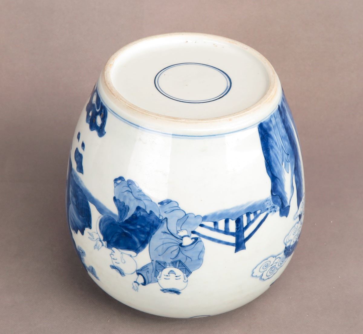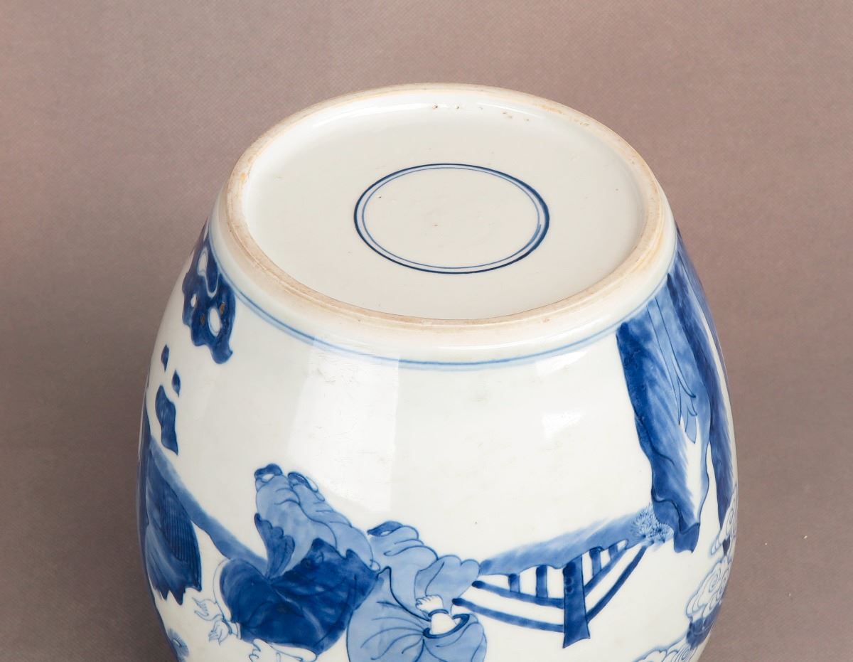 A Chinese blue and white porcelain jar with paintings depicting kids frolicking in the yard. Height 8.25"