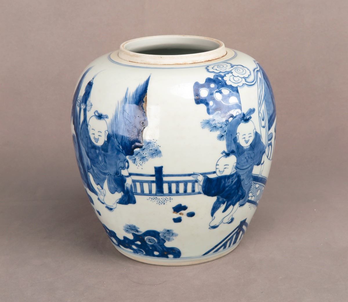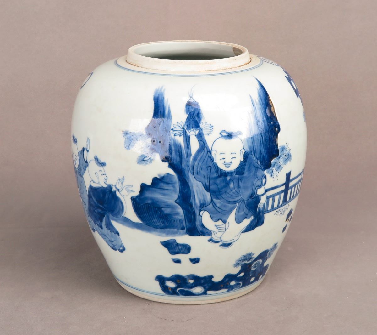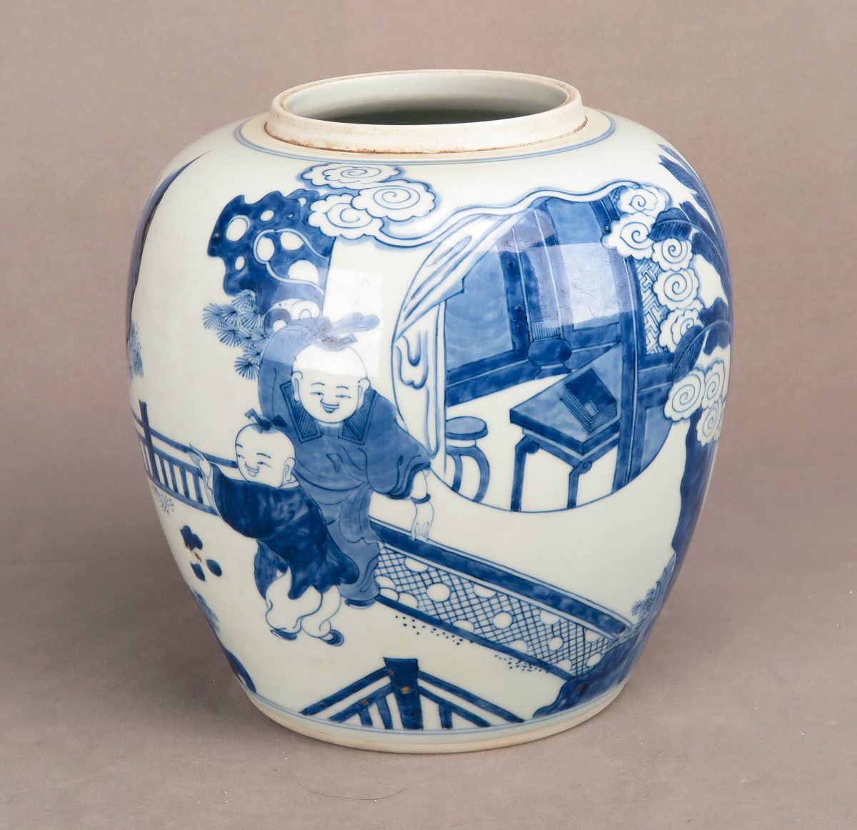 A Chinese blue and white porcelain jar with paintings depicting kids frolicking in the yard. Height 8.25"