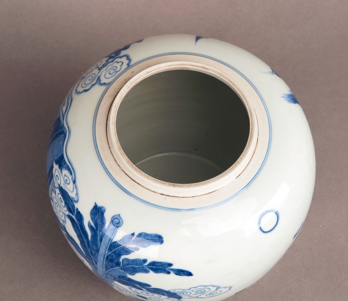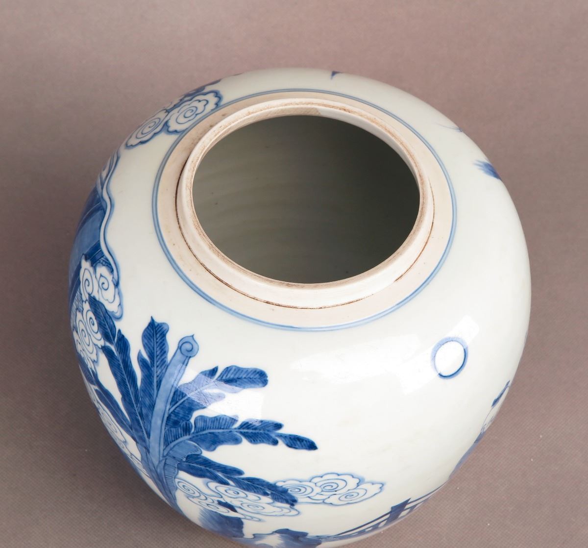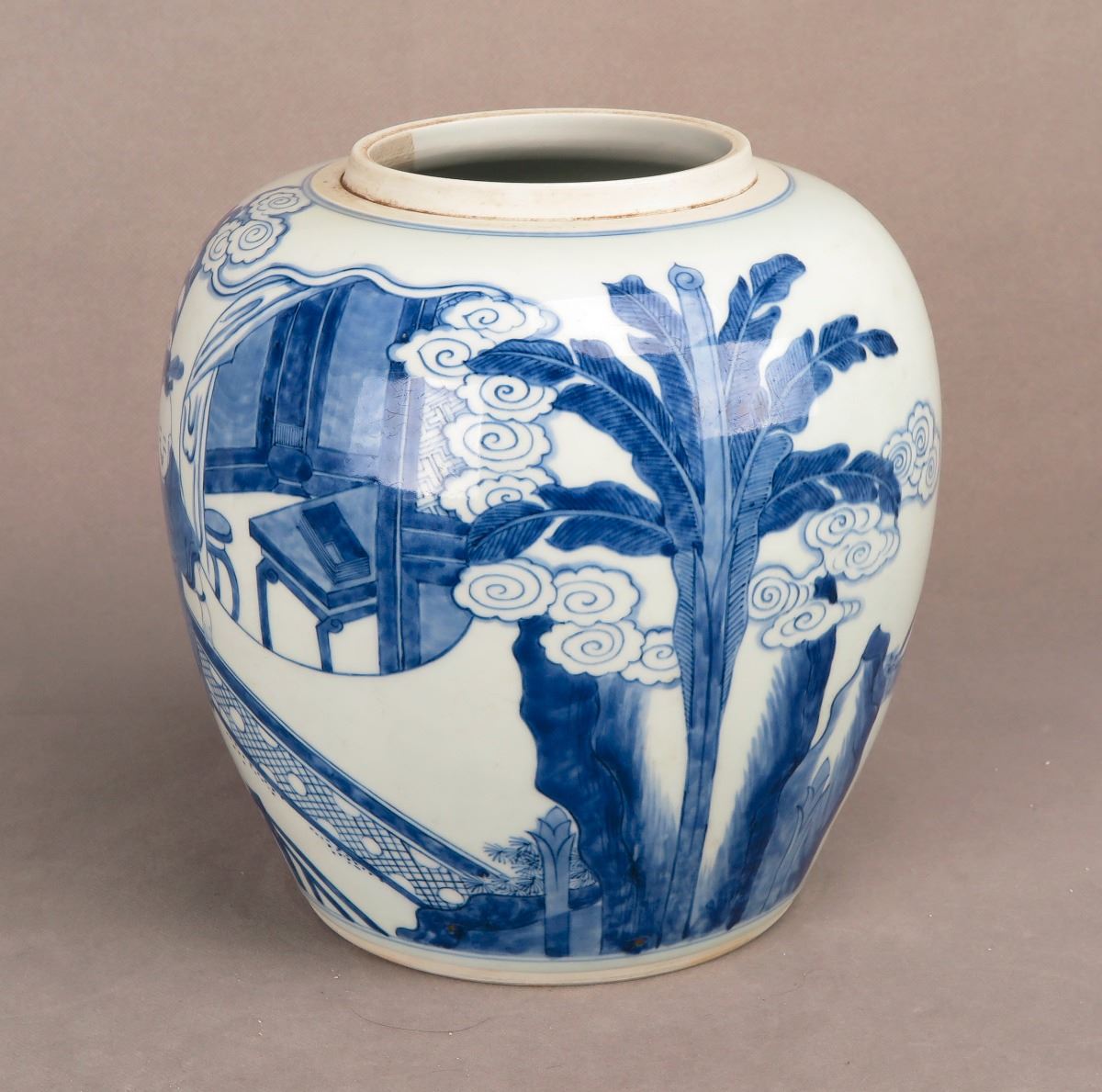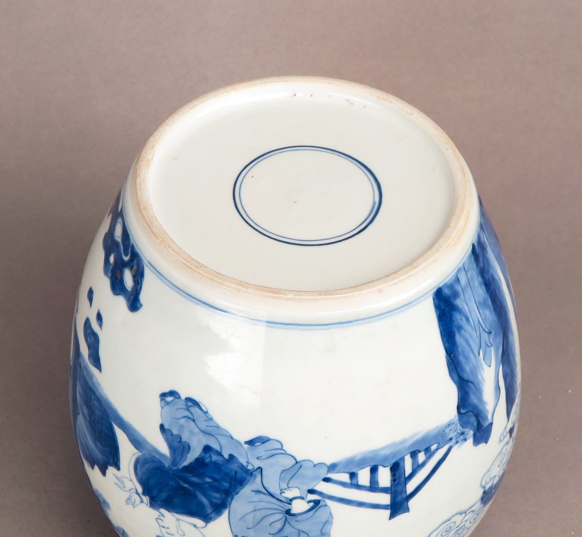 A Chinese blue and white porcelain jar with paintings depicting kids frolicking in the yard. Height 8.25"