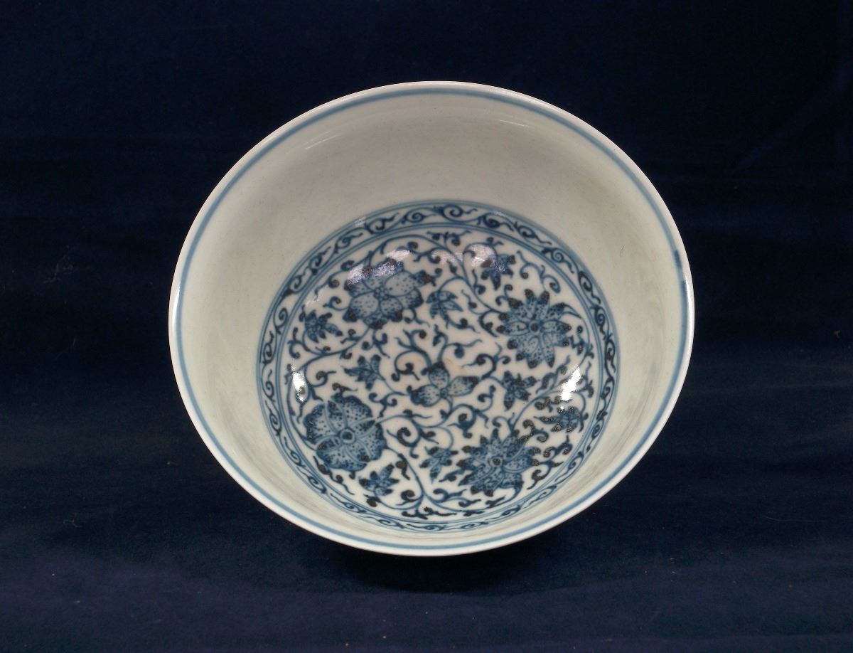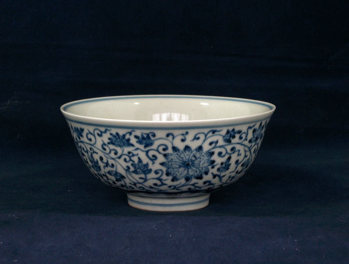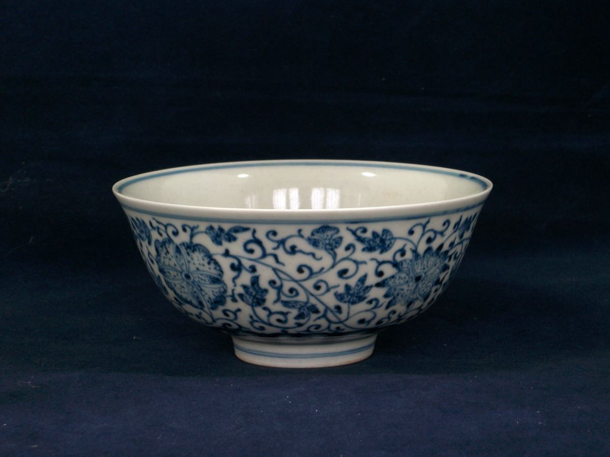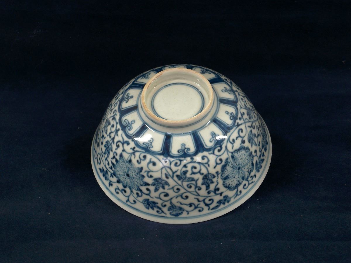 A Chinese blue and white porcelain bowl with flower blossom paintings on the exterior and the circular center on the interior. 6 1/4" 6 1/4" 3"