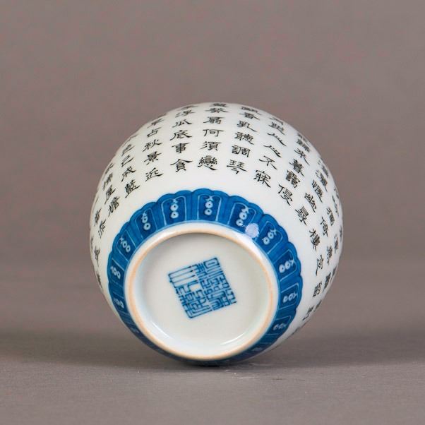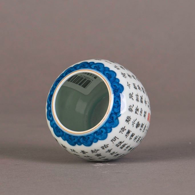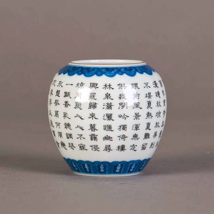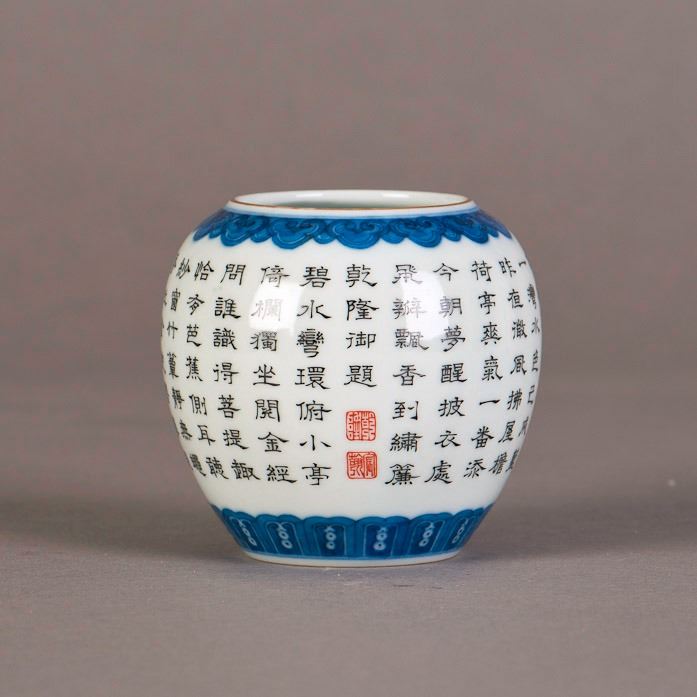 A Chinese blue and white porcelain brush pot, rounded sides rising to the mouth rim, decorated with bands of scrolling waves near the mouth rim and foot ring, featuring Chinese calligraphy verses with two red seals, six-character mark imprinted on the base. Height 3" Diameter 3.25"