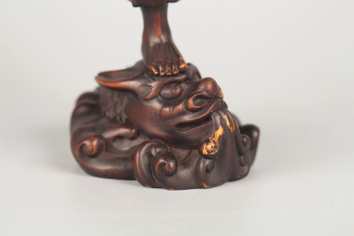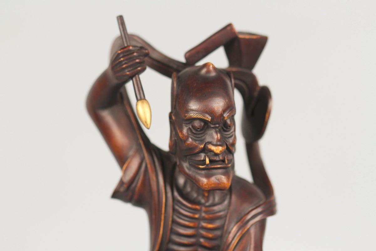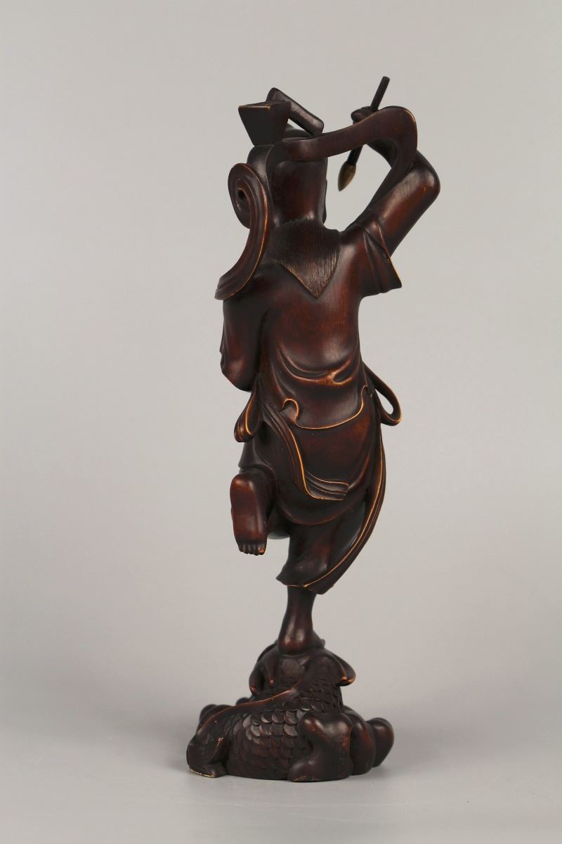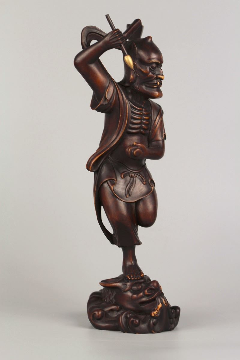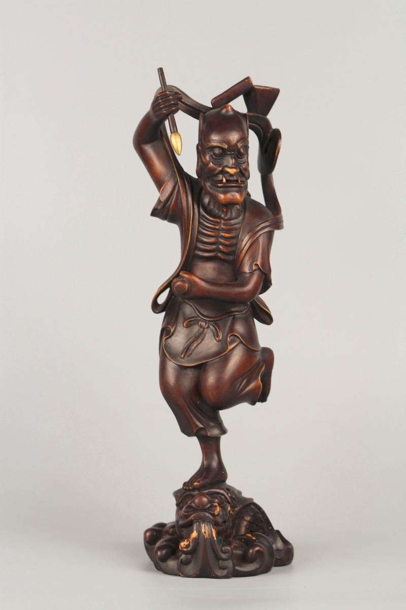 A Chinese box wood statue of Kui Xing Dian Dou with rich color and high sheen, the figure standing on one supporting leg and the other leg lifted, one hand holding Chinese ink and the other holding a brush, represents the act of deity that designate a mortal student to be the top scholar. Height 10.5"