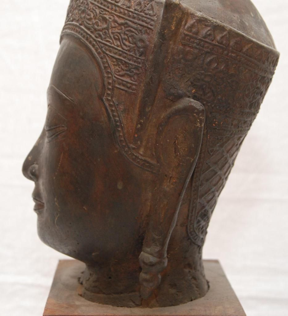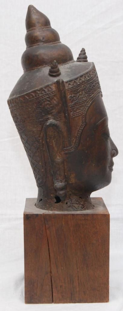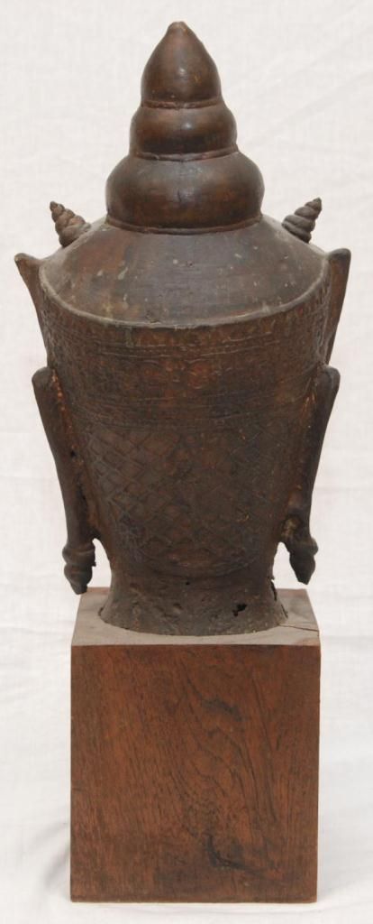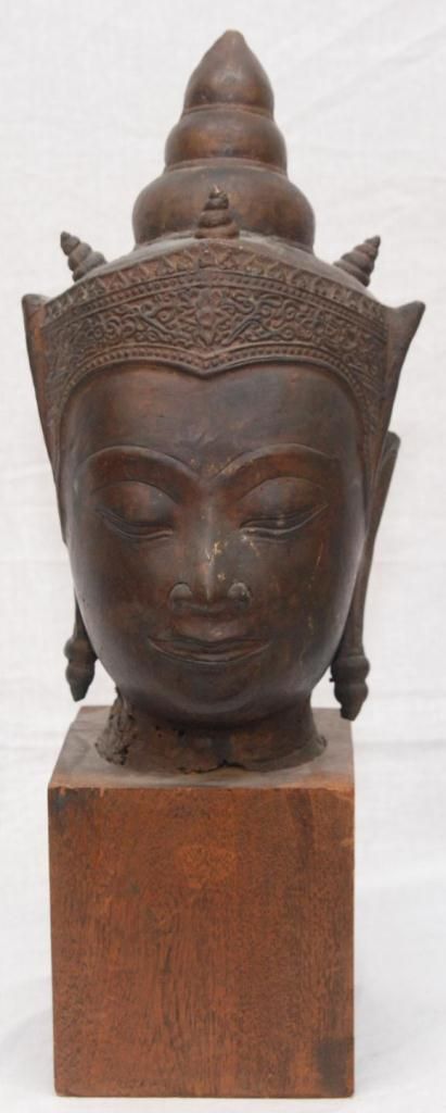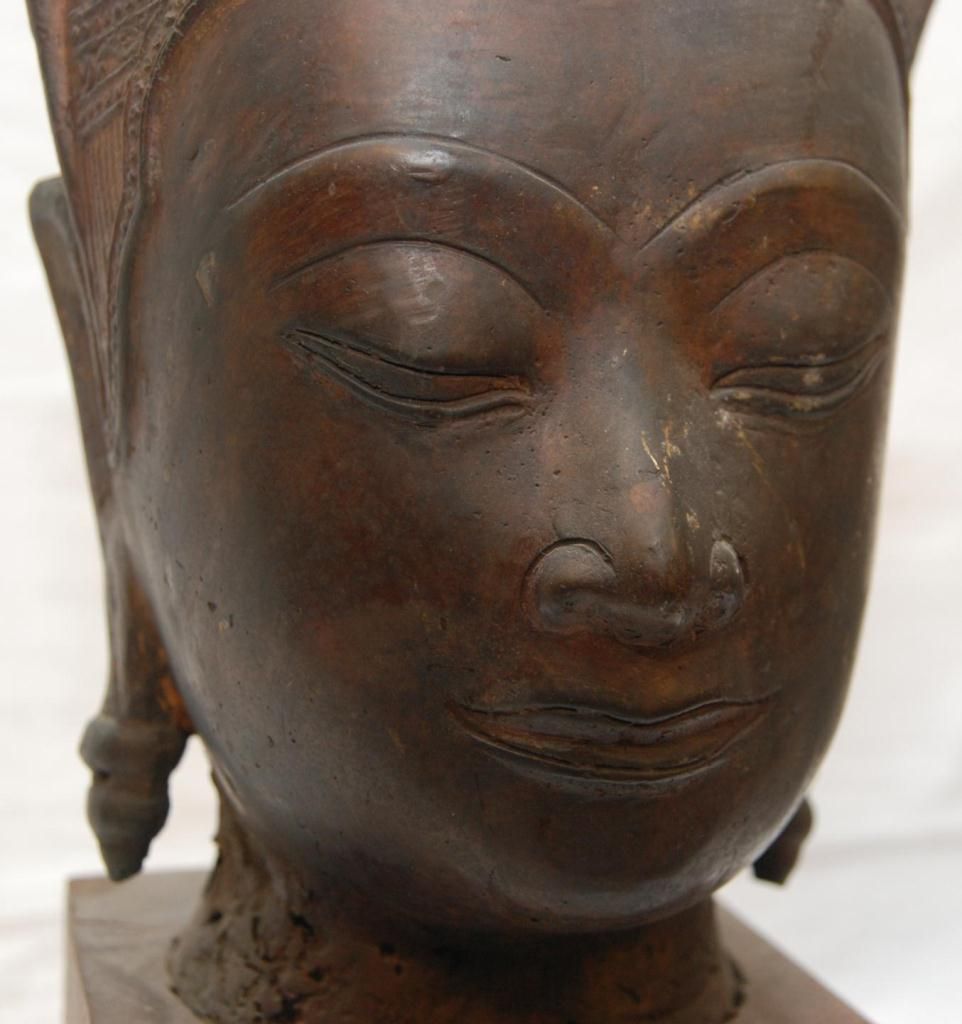 An antique Chinese bronze Buddha head sculpture mounted on wooden block fitted base. Mid to late Qing dynasty. Measures 15" height + 6 3/8" base height (38.1cm + 16.1cm). Total weight of 7.62 kilograms.