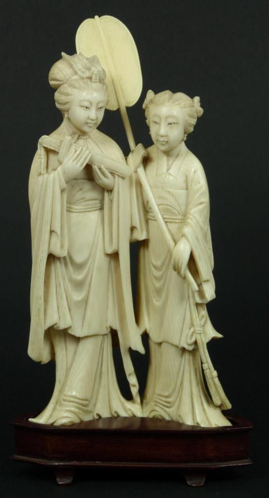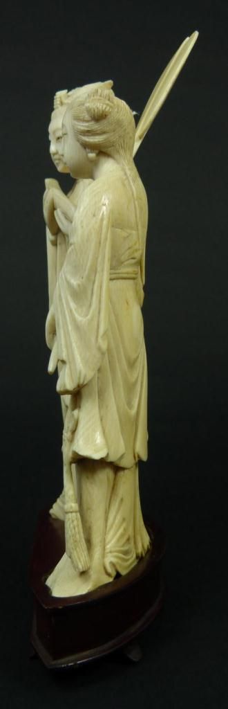 A Chinese fully relief carved ivory group figure depicting an Empress holding a small sword with attendant standing nearby with fan. Includes fitted wooden base. Late Qing dynasty to early Republic period. Measures 7 1/2" height x 3 7/8" width + 1" base height (19cm x 9.8cm + 2.5cm). Total ivory weight of 332 grams.