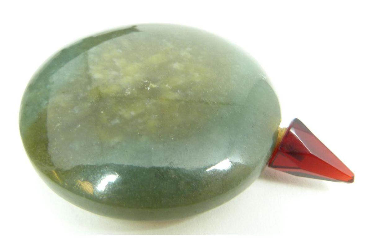 A Chinese hand carved and well hollowed spinach jade snuff bottle. Has red glass stopper. Measures 3" height x 2 1/4" width (7.6cm x 18.4cm). Total weight of 63 grams. Provenance: From a prominent St. Louis estate. Ex Sotheby's, New York 1980's sale.