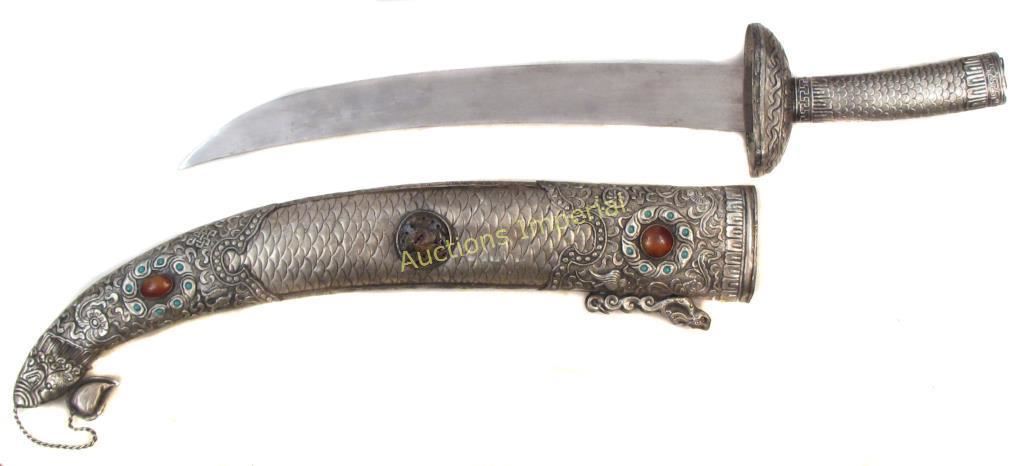 Of massive proportions, the silvered mounts elaborately engraved overall with dragons and other motifs, inlaid with carnelian and turquoise and set with carved hardstone plaques, the broad blade single-edged. 20th century. Light wear. Overall length 100.5 cm.