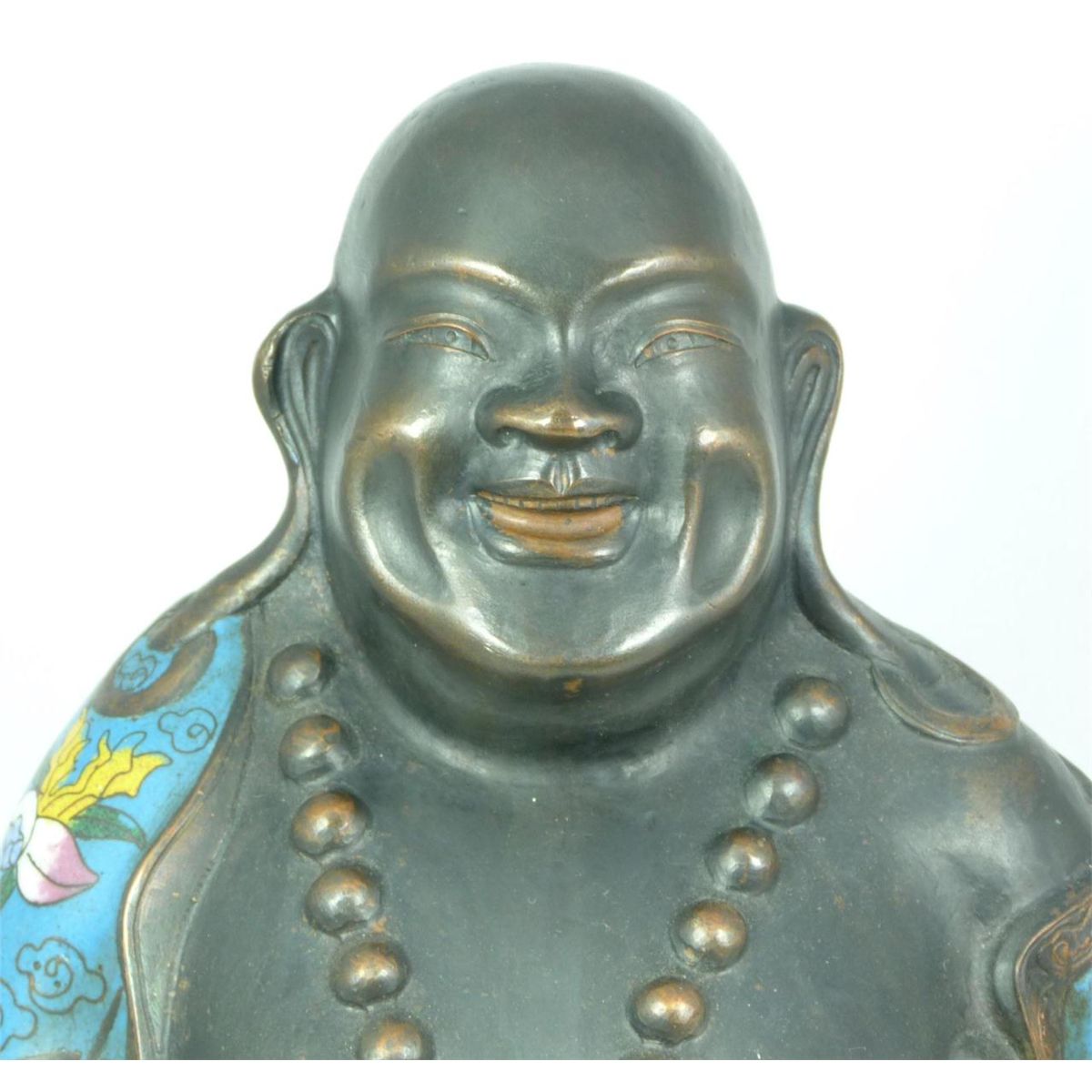 An antique Chinese enameled bronze cloisonne sculpture. Depicts a happy Buddha figure in a standing position. Mid to late Qing Dynasty period. Measures 14 1/2" height (36.8cm). Total weight of 2004 grams.