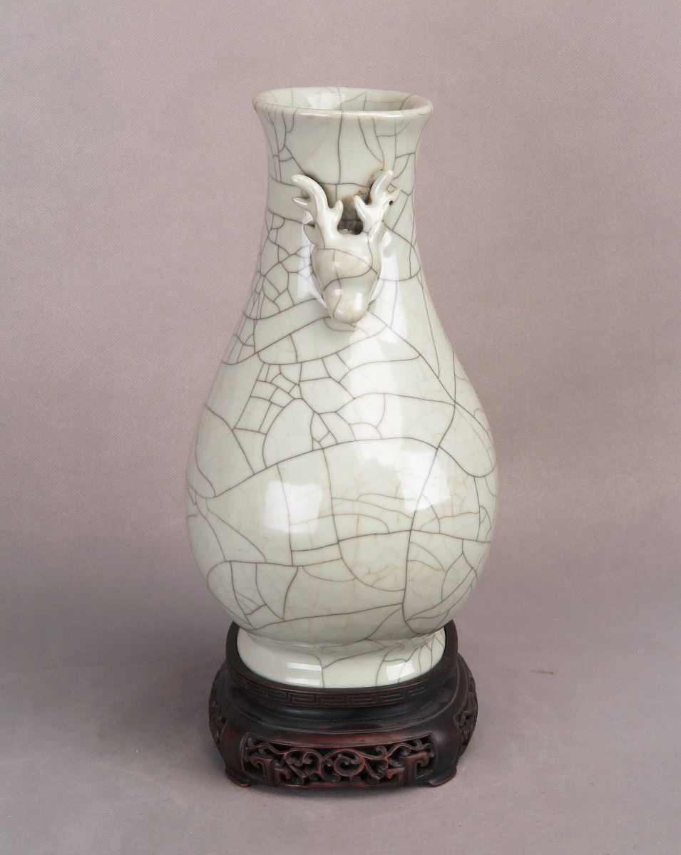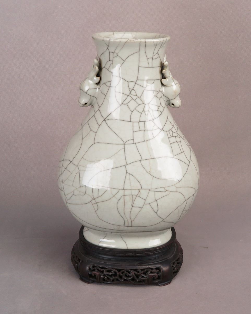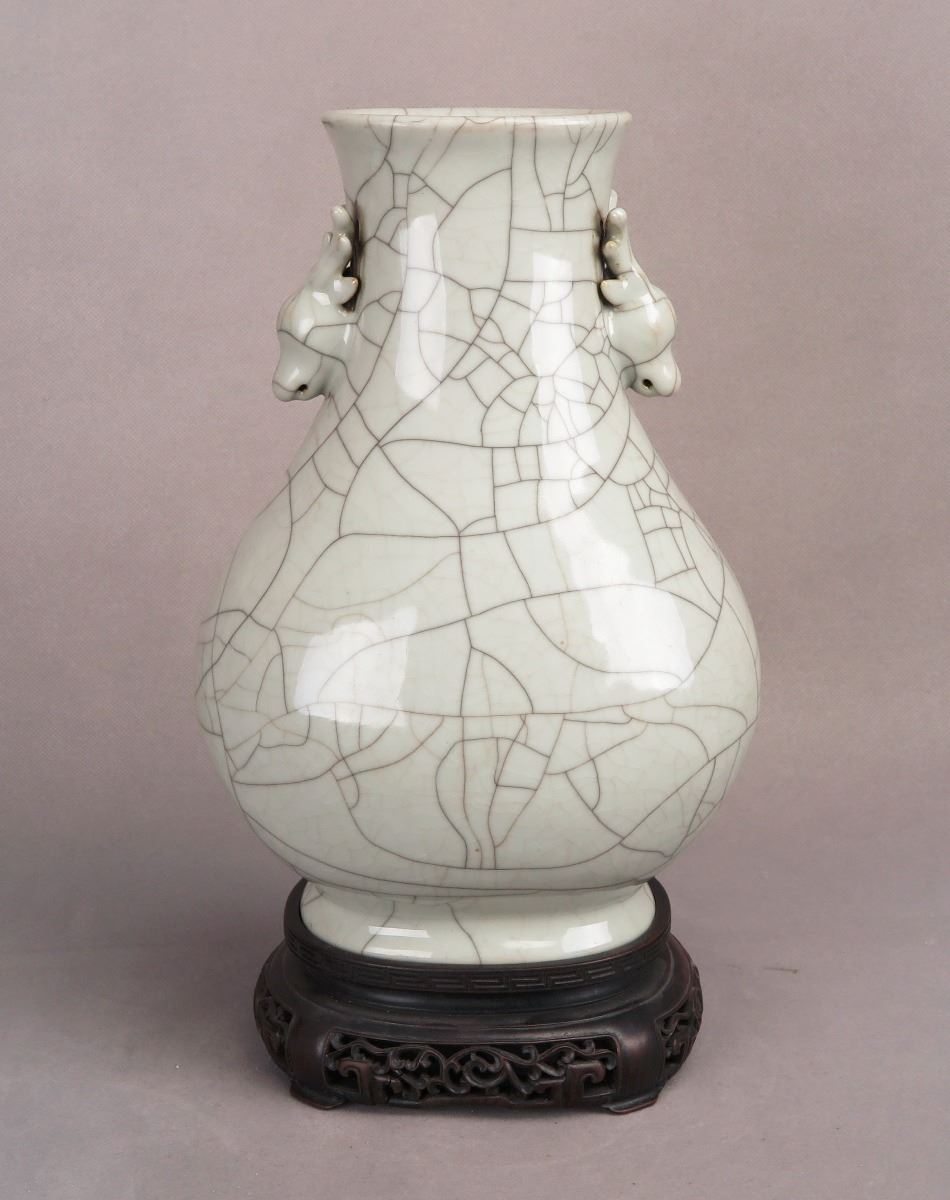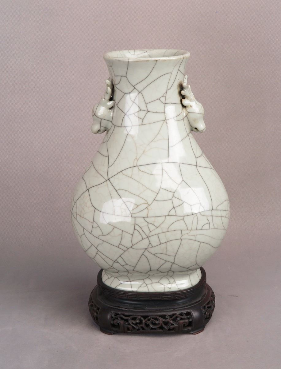 A Chinese crackle-glazed Zun with wooden base and handles in the form of auspicious beasts, bearing Made in Qing Qian Long Period mark on the base. Height 11" Length/Width 7"x5.5"