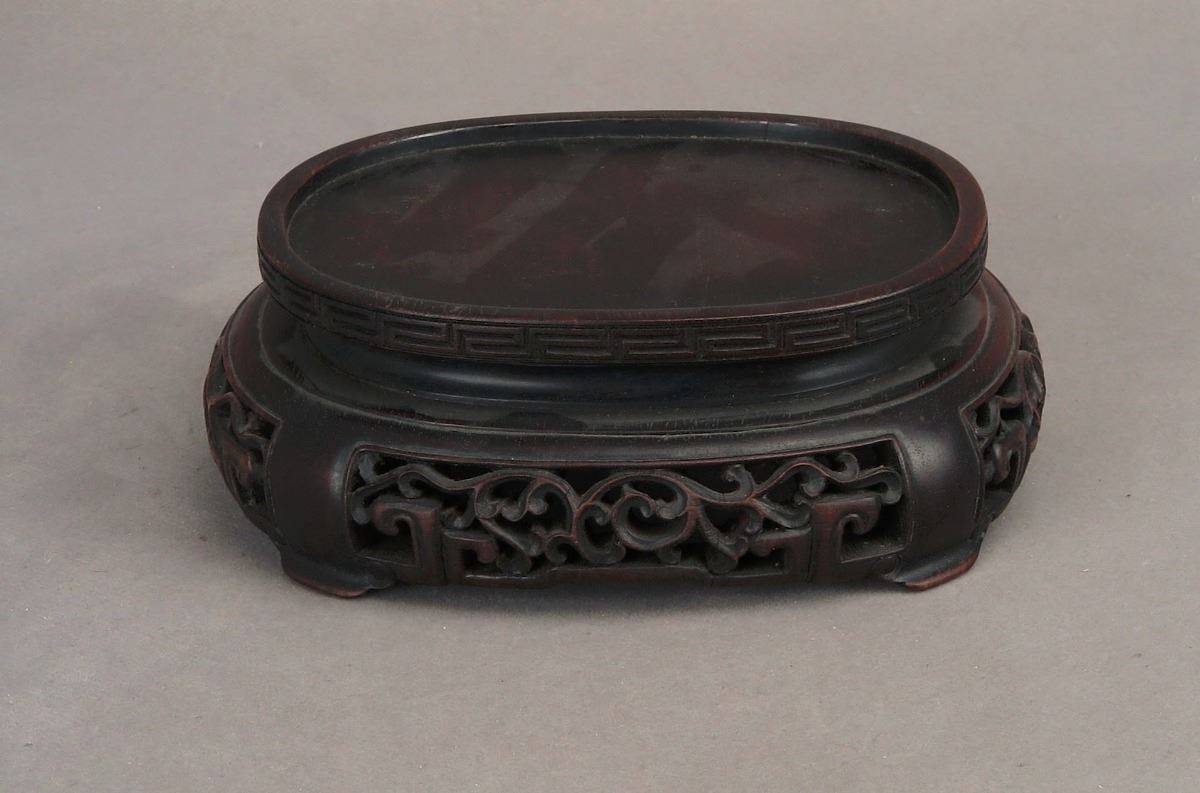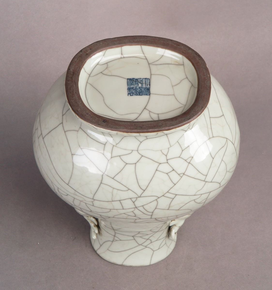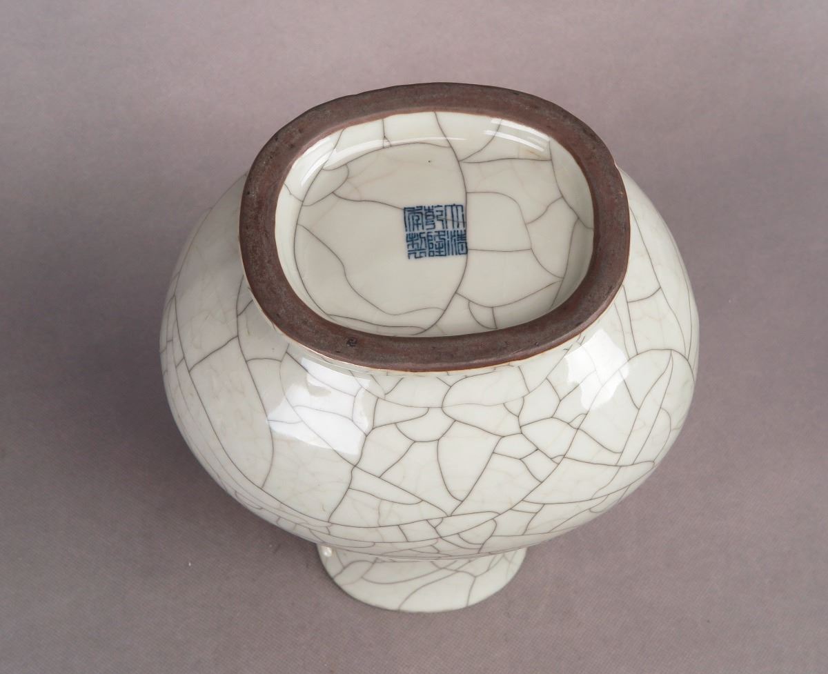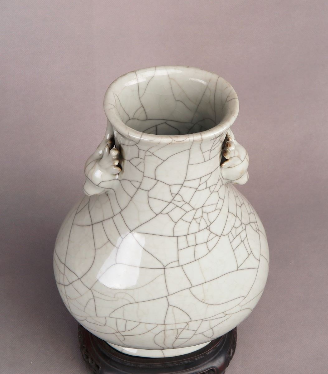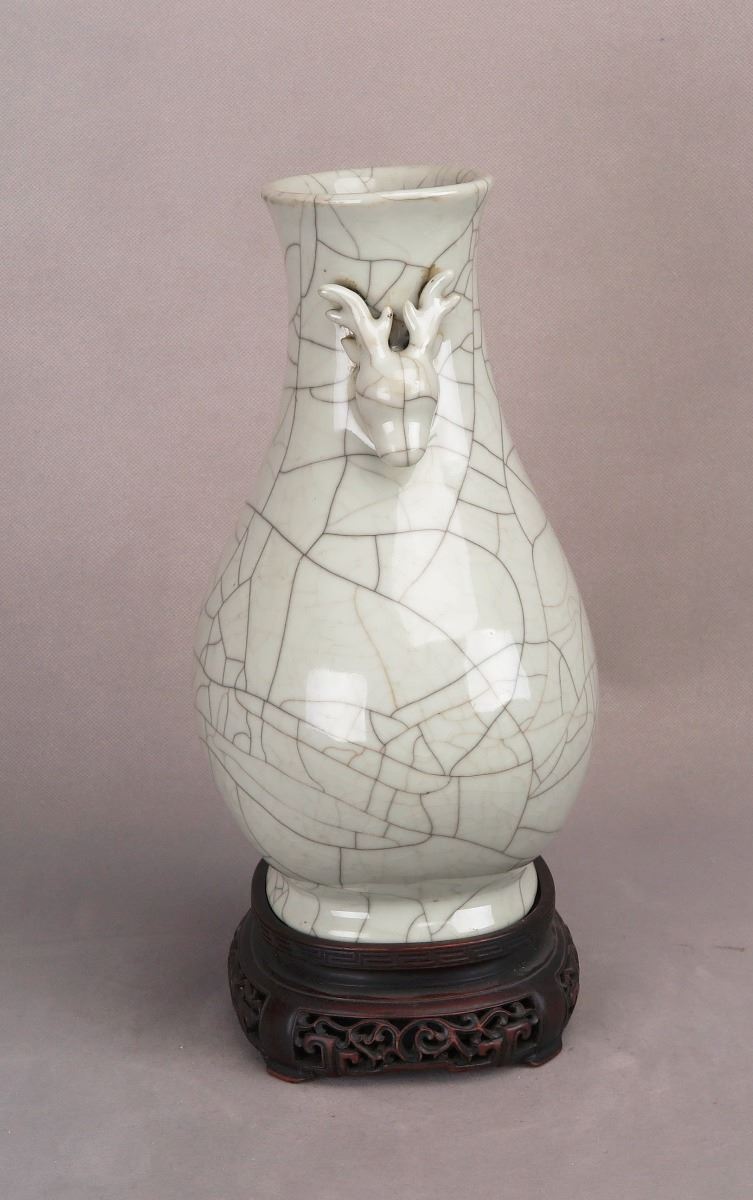 A Chinese crackle-glazed Zun with wooden base and handles in the form of auspicious beasts, bearing Made in Qing Qian Long Period mark on the base. Height 11" Length/Width 7"x5.5"