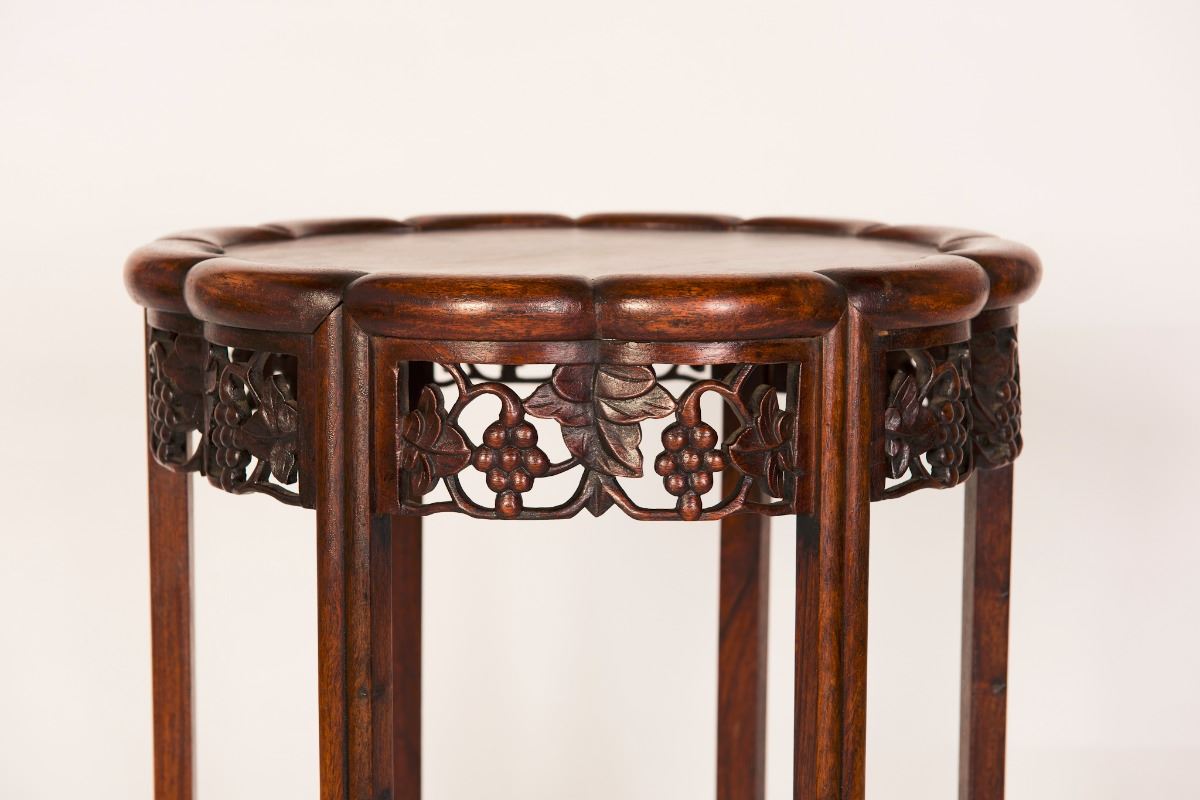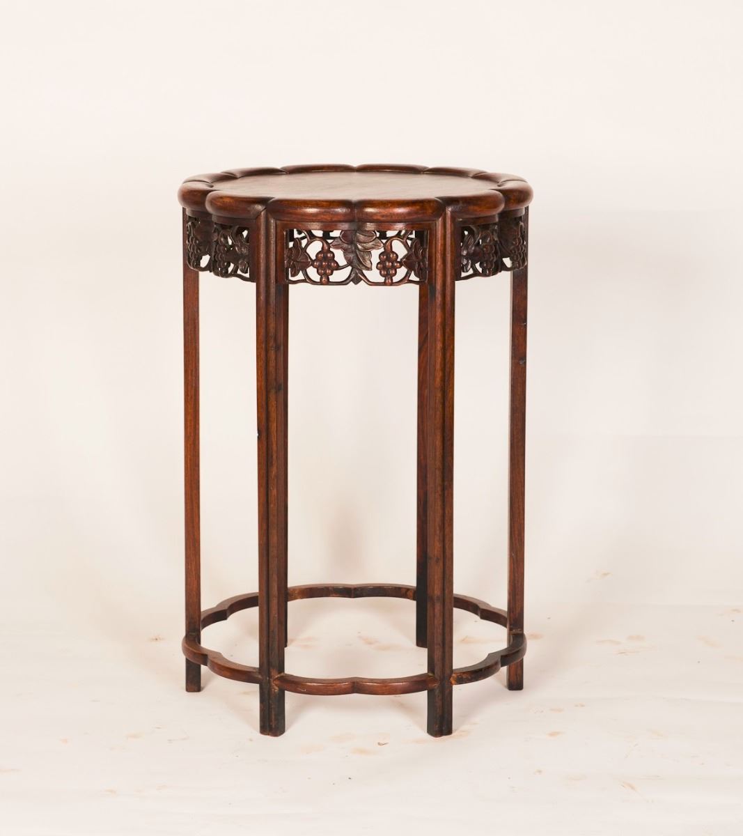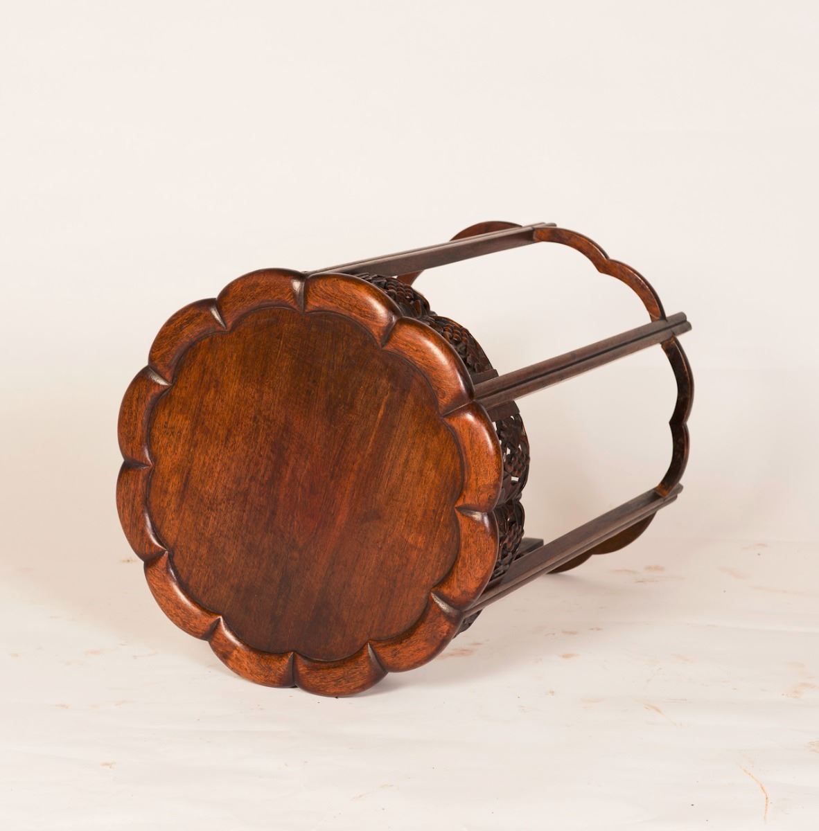 A Chinese style cylindrical chair featuring unique design of floral peDAL outline and apron with carved openwork detailing. Diameter 17.5" Height 26"