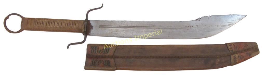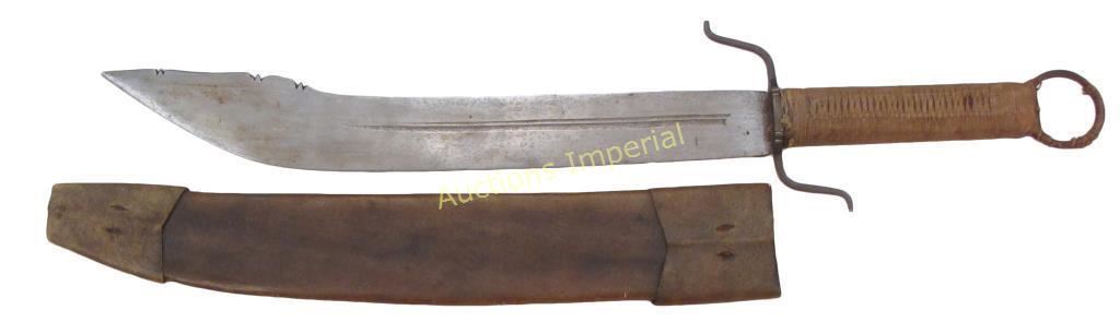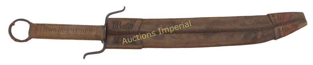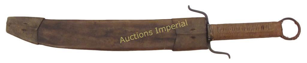 Latter Qing Dynasty work, of ring-pommel form, with gripwrap intact. Broad, handforged, fullered blade with profiled tip. In its hide scabbard with separately-applied pierced locket and chape with polychroming. Late 19th century. Some wear. Overall length 59 cm.