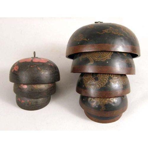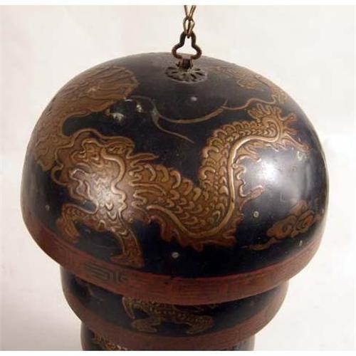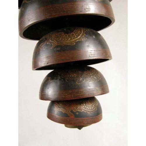 A CHINESE DRAGON-DECORATED GONG BELL WITH FIVE BOWLS<BR><BR>together with a partial black-and-red lacquer gong bell, missing several bowls and the clapper. Five bowl bell 9" h.