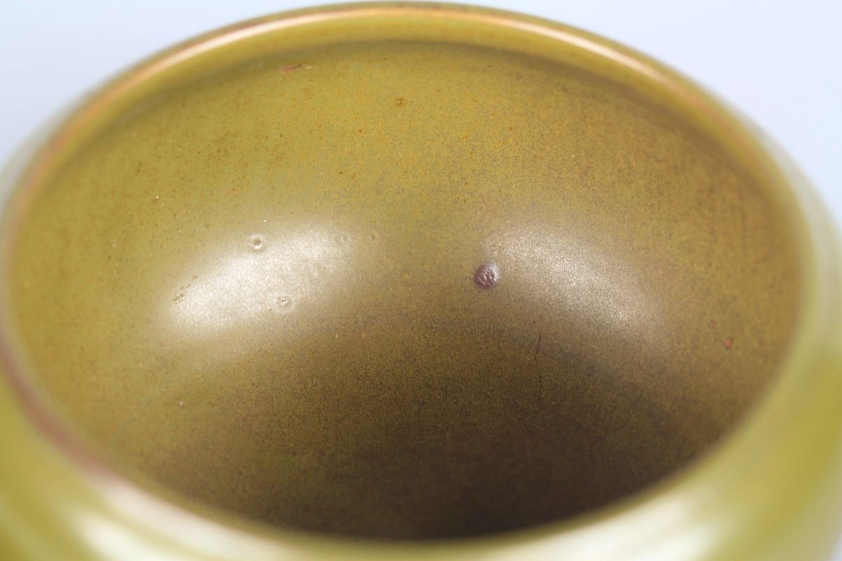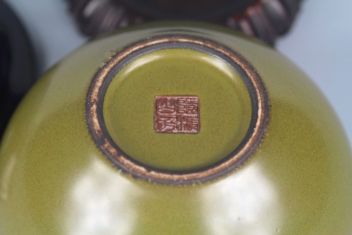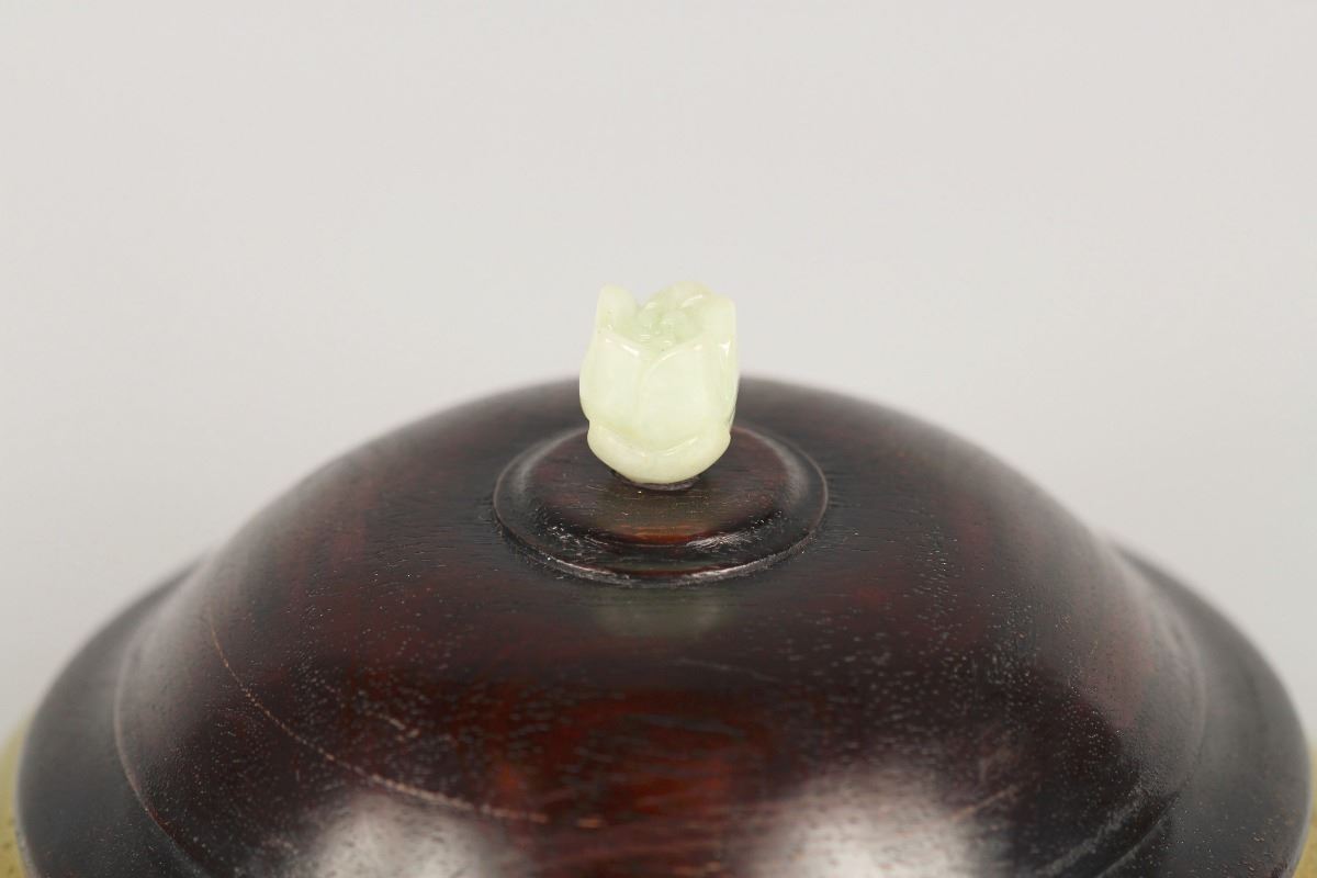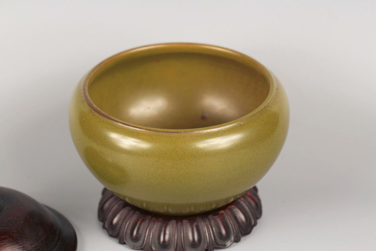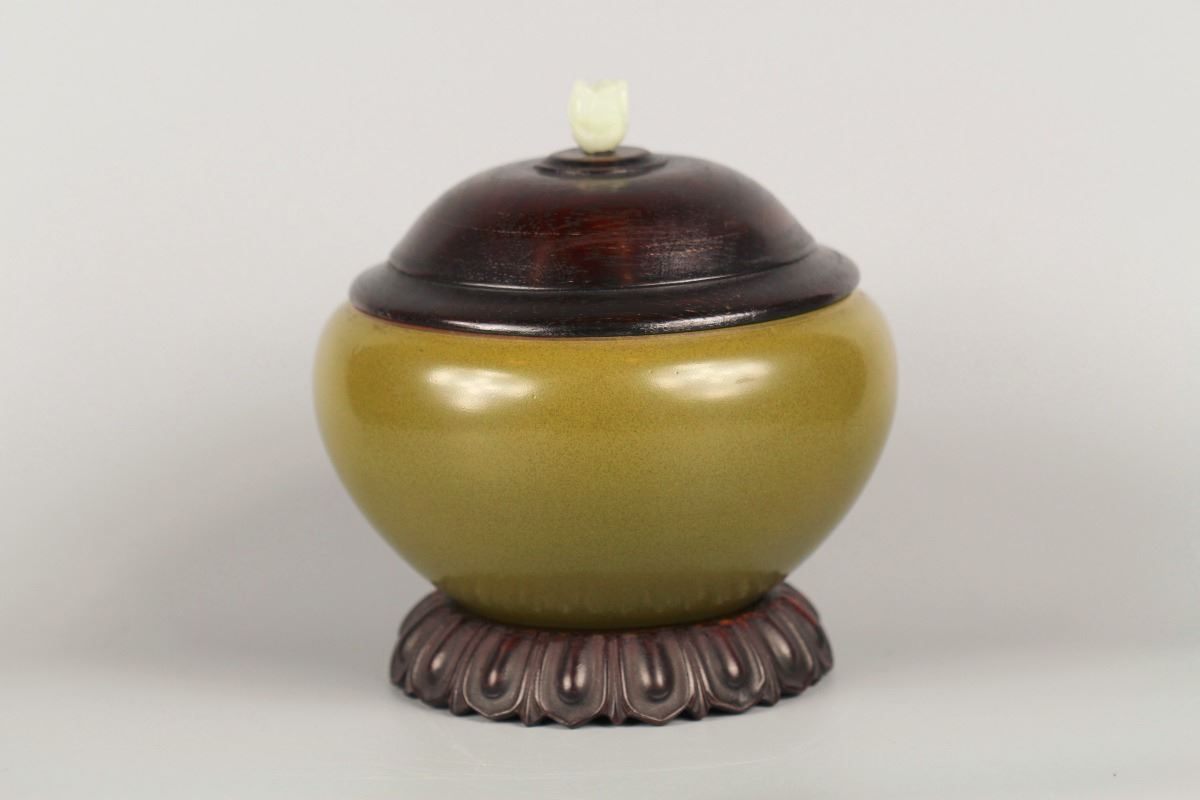 A Chinese earthen bowl of rounded body with wooden lid with jade handle and wooden base, a mixed of green and yellow glaze in high sheen on both the interior and exterior, bearing incised four-character seal on the base. Height 5.5"