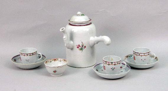 Together with three similar mugs, a bowl, and three saucers. 8 pieces.
