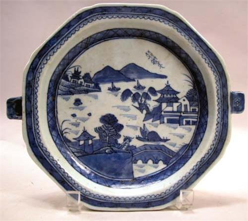 A CHINESE EXPORT PORCELAIN OCTAGONAL WARMING VEGETABLE DISH; Canton pattern, with pierced projecting handles 11"w