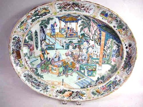 A CHINESE EXPORT PORCELAIN OVAL PLATTER, celadon ground, figures within courtyard, rim wear and chips, 19th c., 18-1/2"l x 15"w