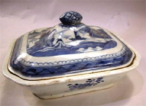 A CHINESE EXPORT PORCELAIN RECTANGULAR COVERED DISH; Canton pattern, with notched corners 9 3/4"w (losses)
