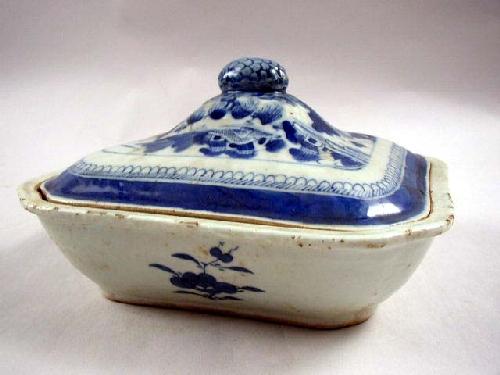 A CHINESE EXPORT PORCELAIN RECTANGULAR COVERED VEGETABLE DISH; Canton, with notched corners and imbricated knop, minor chips, 8 1/4"l