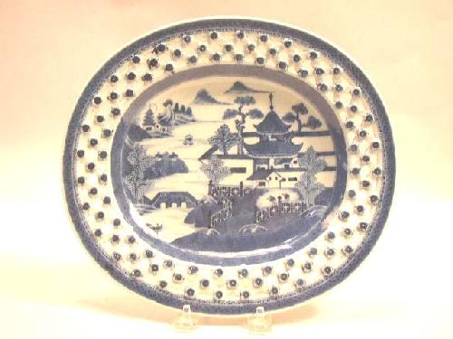 A CHINESE EXPORT PORCELAIN RETICULATED UNDERPLATE; Nanking pattern, of oval form with floret decorated border 10 3/4"l