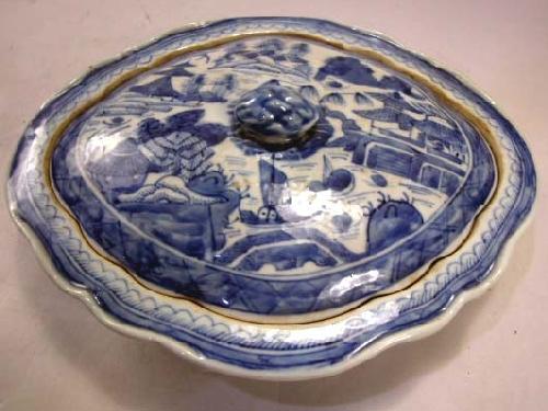 A CHINESE EXPORT PORCELAIN TRAPEZOIDAL COVERED VEGETABLE DISH; Canton pattern, with ruffled border 10 1/2"w