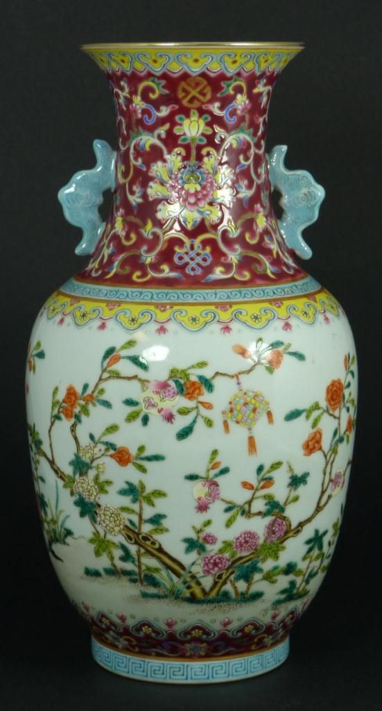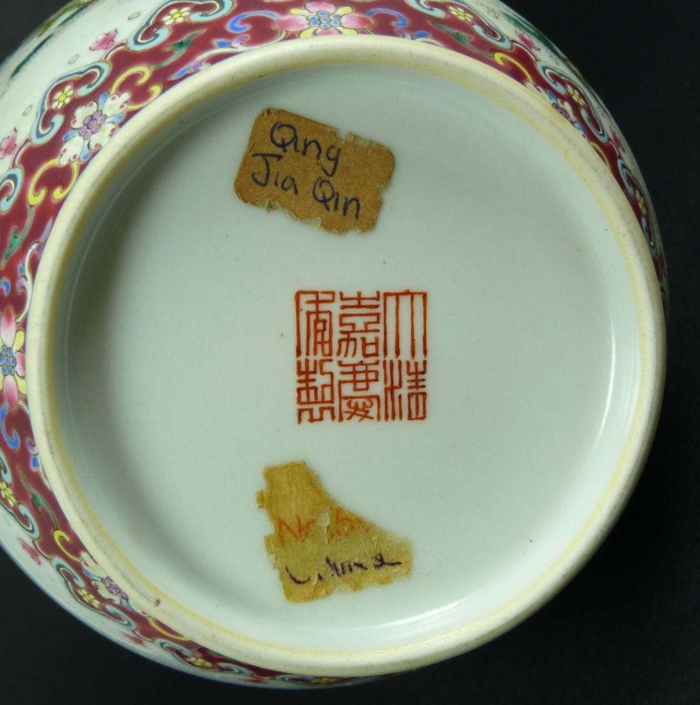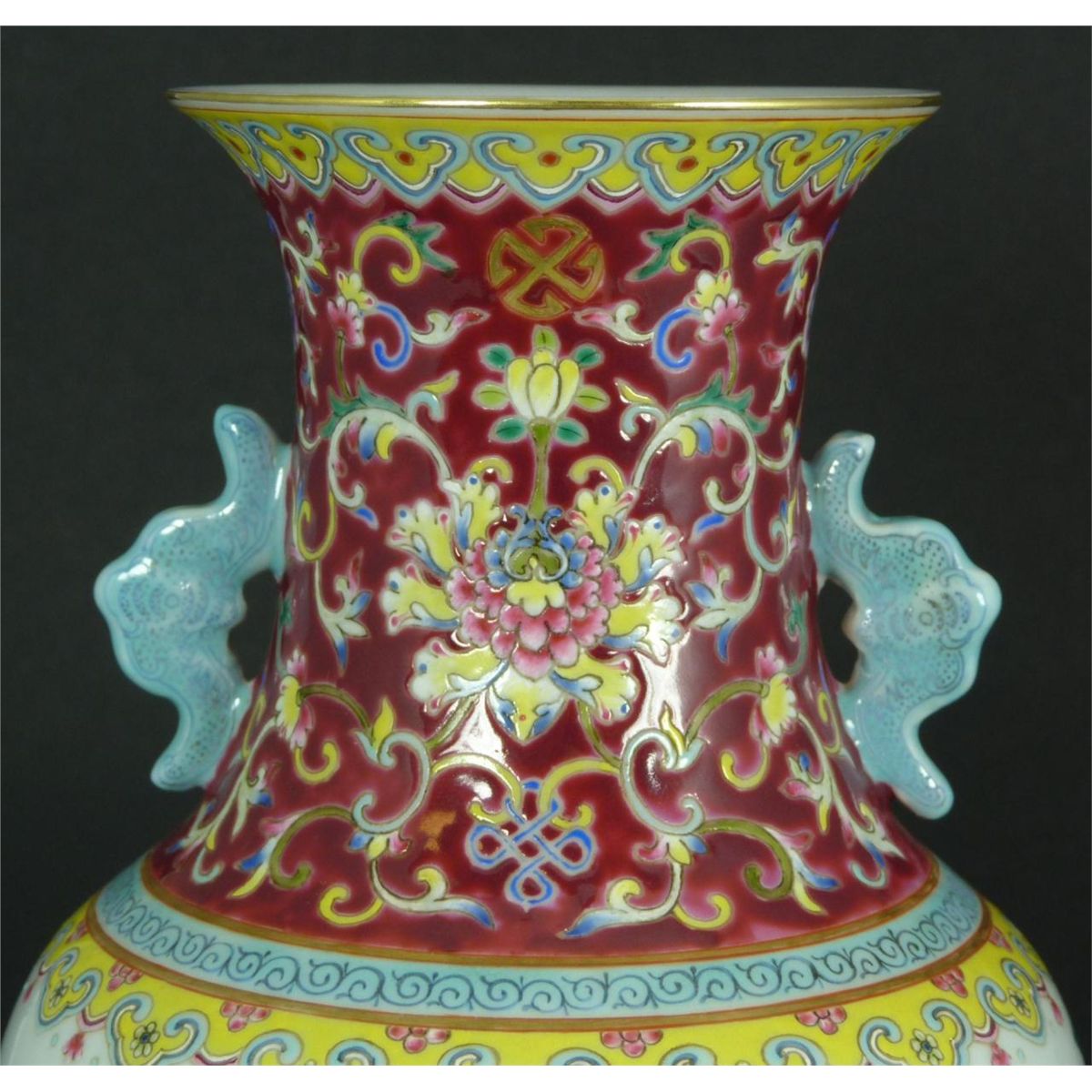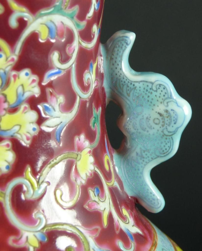 A Chinese Famille Rose enameled and hand painted handled phoenix tail form vase. Two figural bat handles to neck over lotus blossom and scrolled vine design with red ground. Landscape floral scene to body. Holds red archaic Jiaqing reign marks to bottom. Measures 9 7/8" height x 5 1/4" diameter (25cm x 13.3cm). Total weight of 791 grams.
