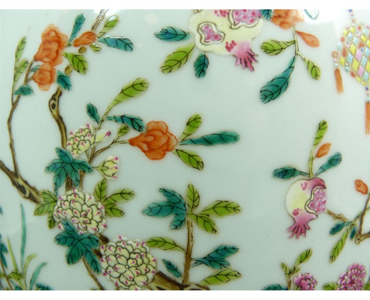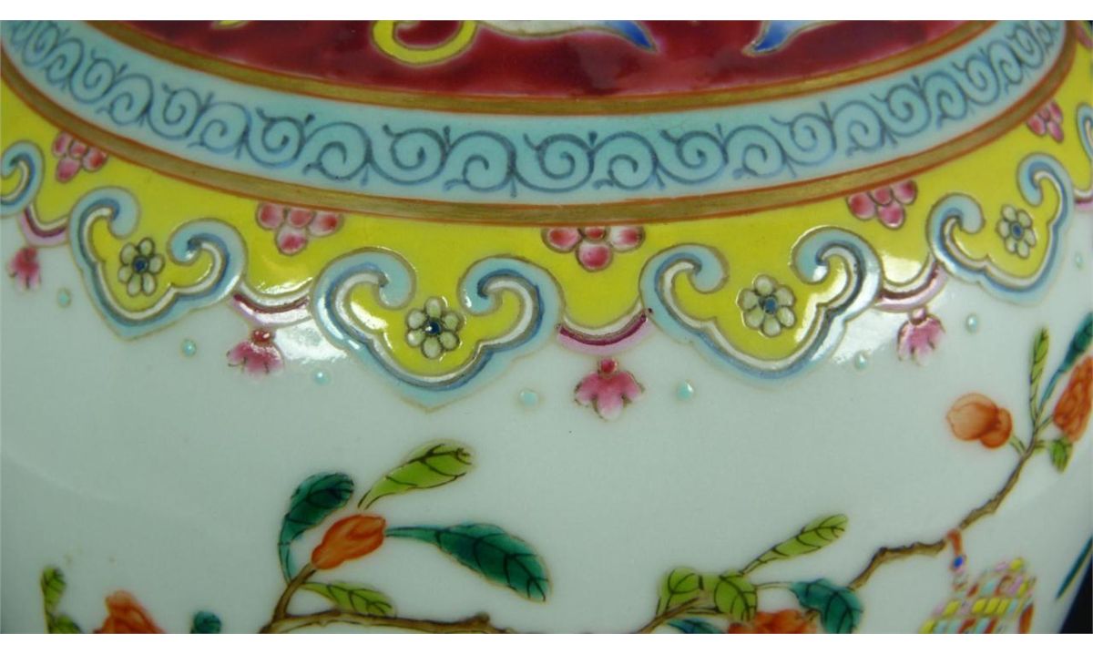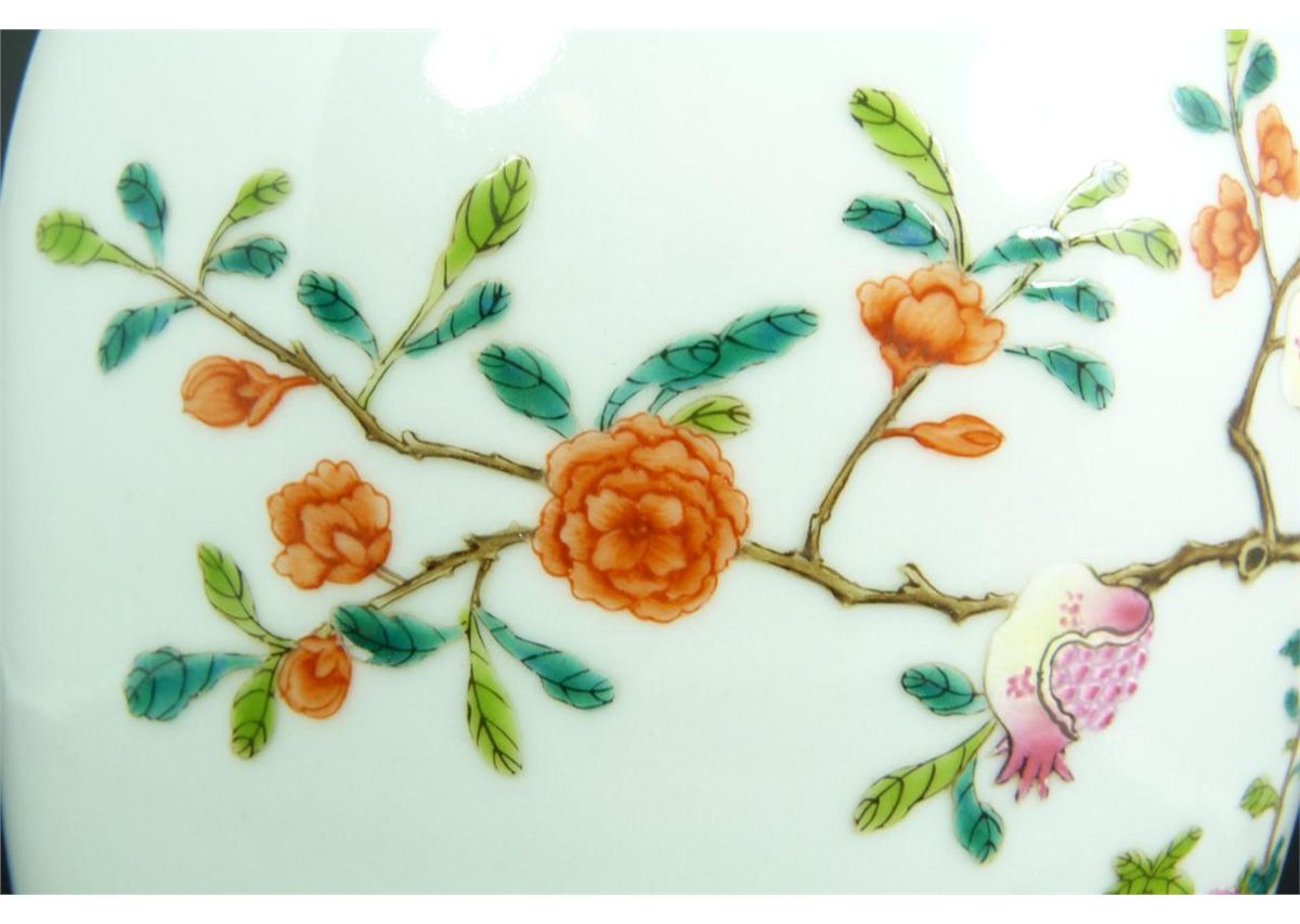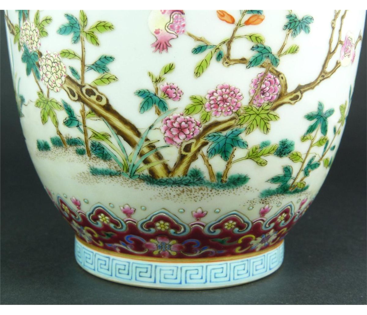 A Chinese Famille Rose enameled and hand painted handled phoenix tail form vase. Two figural bat handles to neck over lotus blossom and scrolled vine design with red ground. Landscape floral scene to body. Holds red archaic Jiaqing reign marks to bottom. Measures 9 7/8" height x 5 1/4" diameter (25cm x 13.3cm). Total weight of 791 grams.