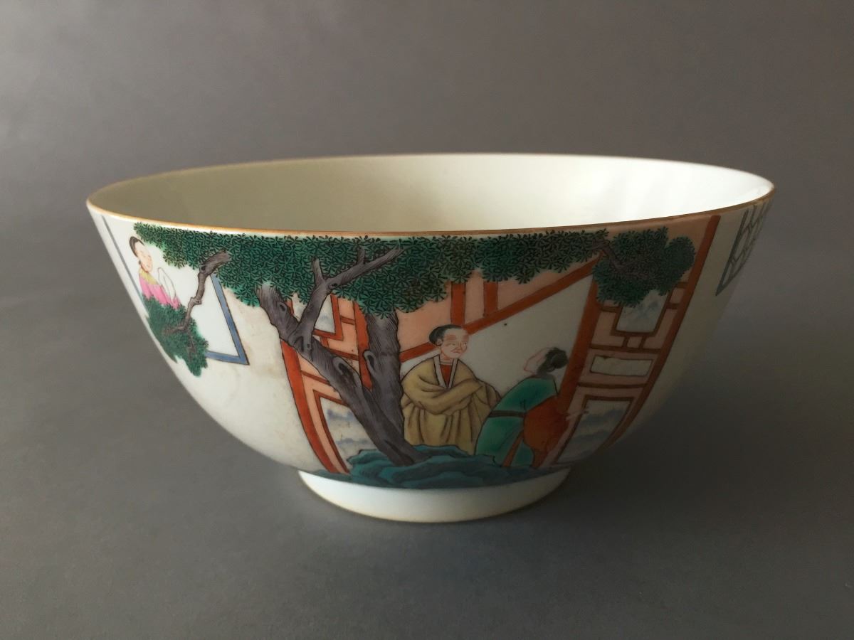 A Chinese porcelain bowl with polychrome painting of scholars, six-character seal on the base. Diameter 7.75"
