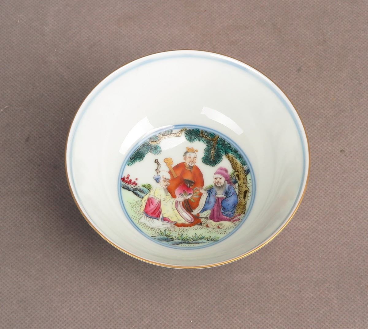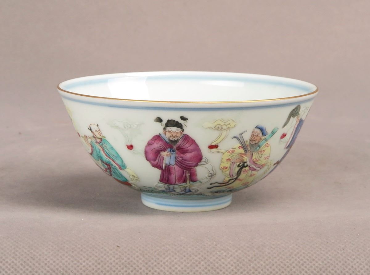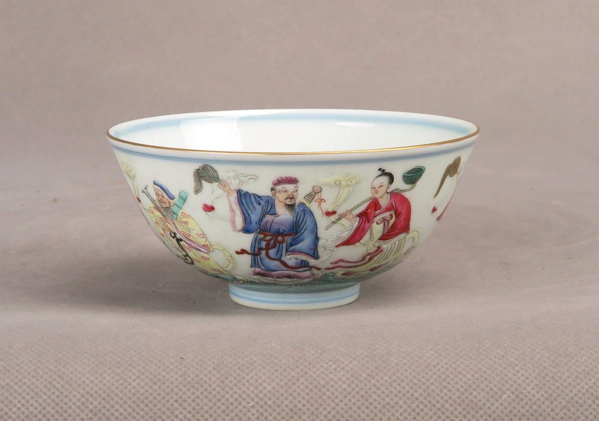 A Chinese famille rose porcelain vase decorated with painting of eight-immortals and a golden mouth rim, interior with circular painting of three immortals under the pine tree, bearing a seal on the base. Diameter 4.25", Height 2"