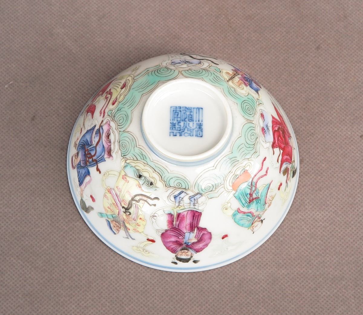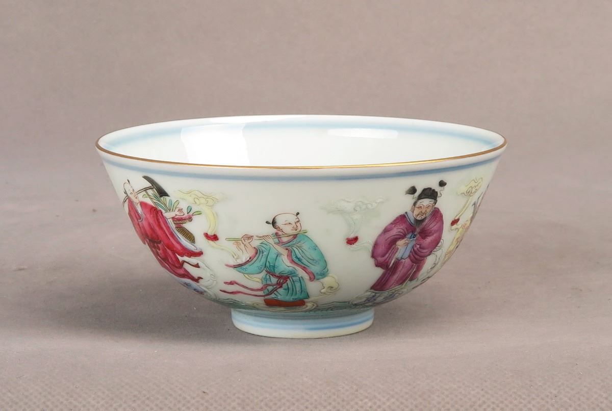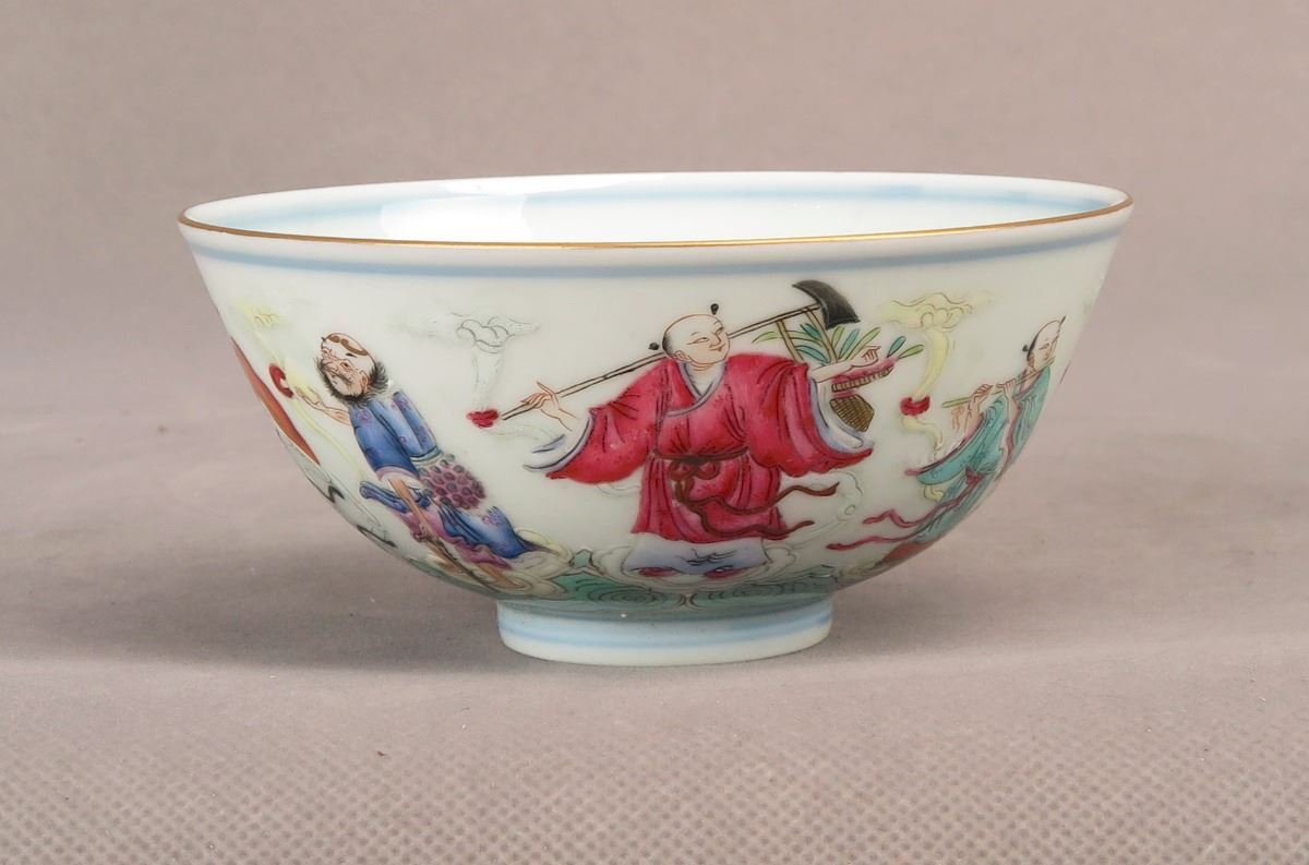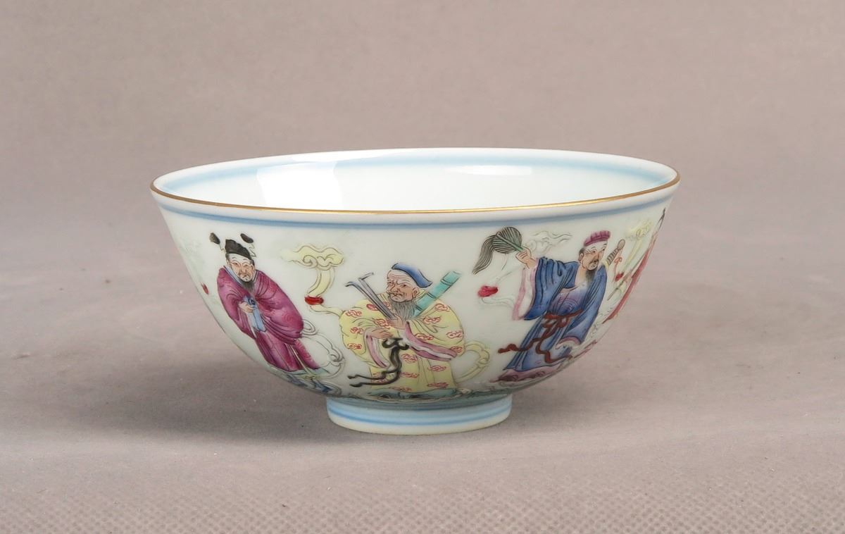 A Chinese famille rose porcelain vase decorated with painting of eight-immortals and a golden mouth rim, interior with circular painting of three immortals under the pine tree, bearing a seal on the base. Diameter 4.25", Height 2"