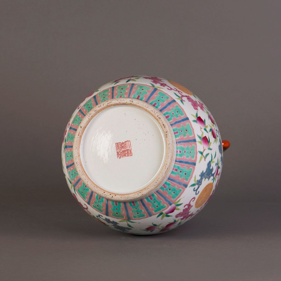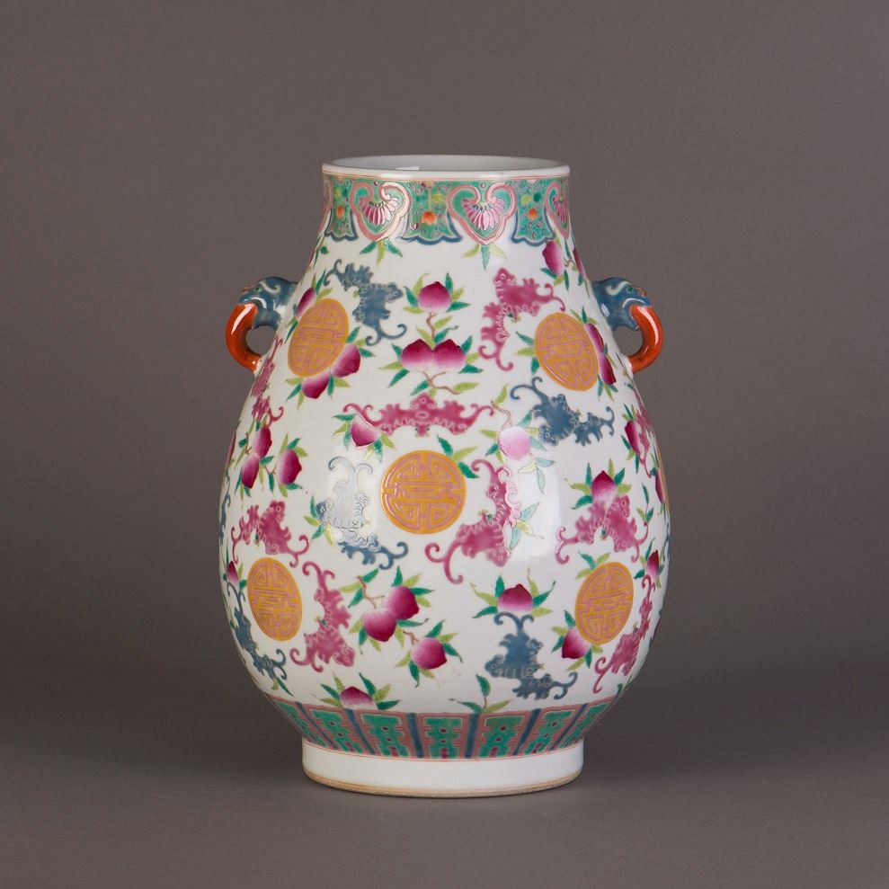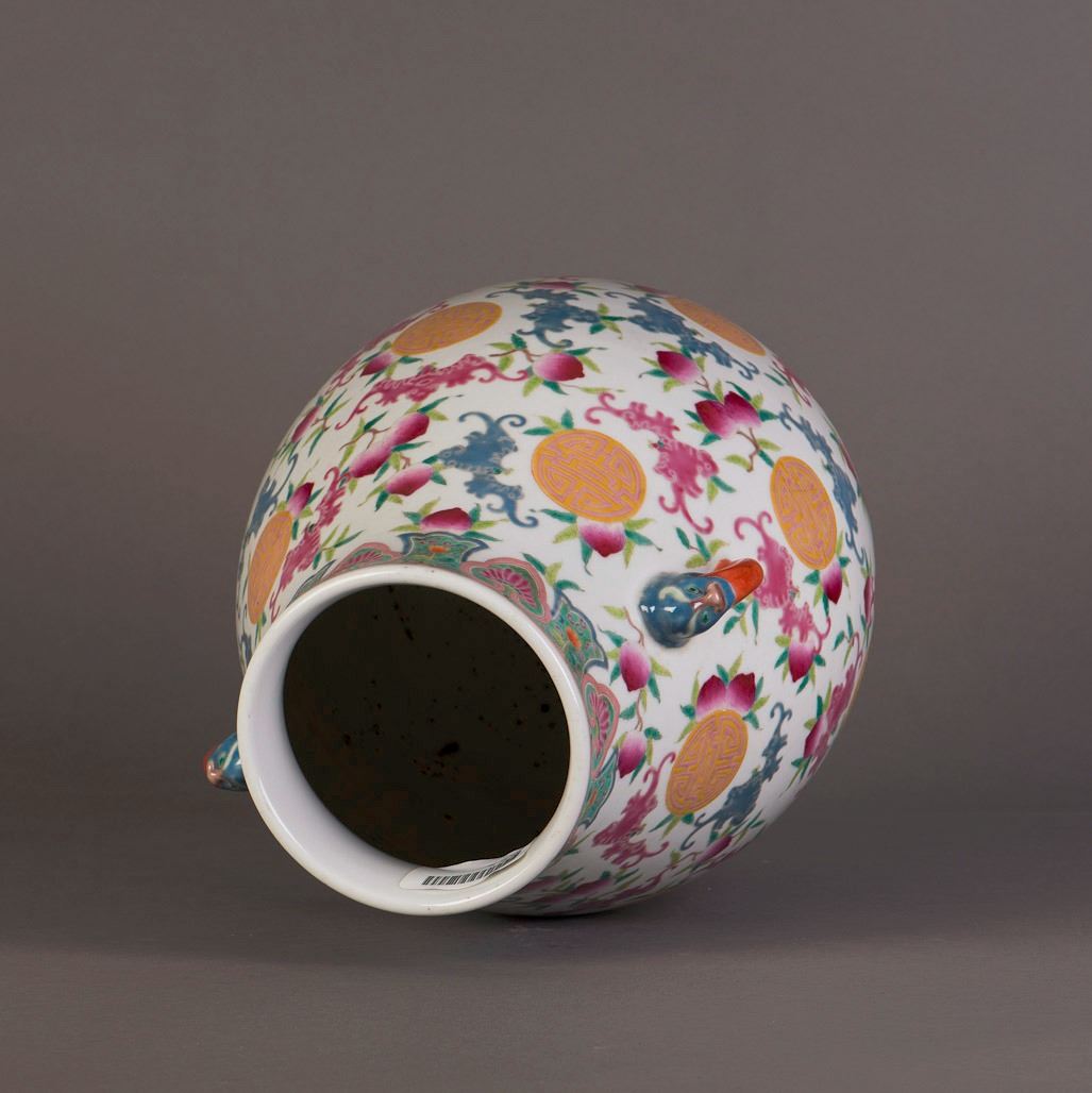 A famille rose porcelain vase supported on a short foot and a rounded body tapering towards the mouth, featuring famille rose paintings of longevity peaches and evenly scattered auspicious symbols, two small loop handles in the form of beasts, bearing a six-character seal on the base. Height 15" Diameter 10"